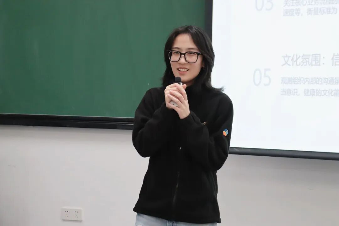 围绕组织诊断的现实意义,黄娟老师进一步介绍了组织健康度的相关内容。她从战略对齐、架构权责、流程效率、人才能力、文化氛围等维度出发,深入分析了影响组织运行成效的关键因素,并结合实际工作经验,帮助同学们理解如何从系统视角观察组织状态、识别潜在问题。她指出,组织诊断如同对企业开展一次系统性“体检”,不仅有助于发现表层现象,更能够帮助管理者透过现象把握问题根源,为后续优化与改进提供依据。