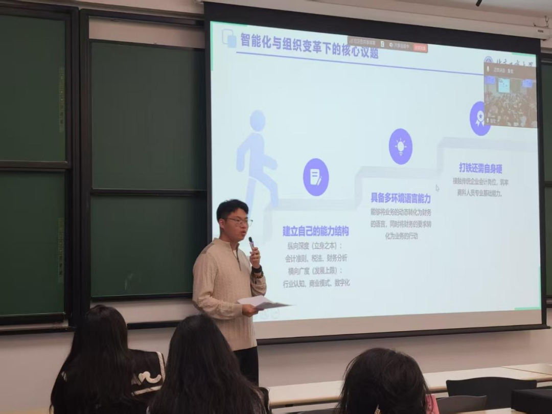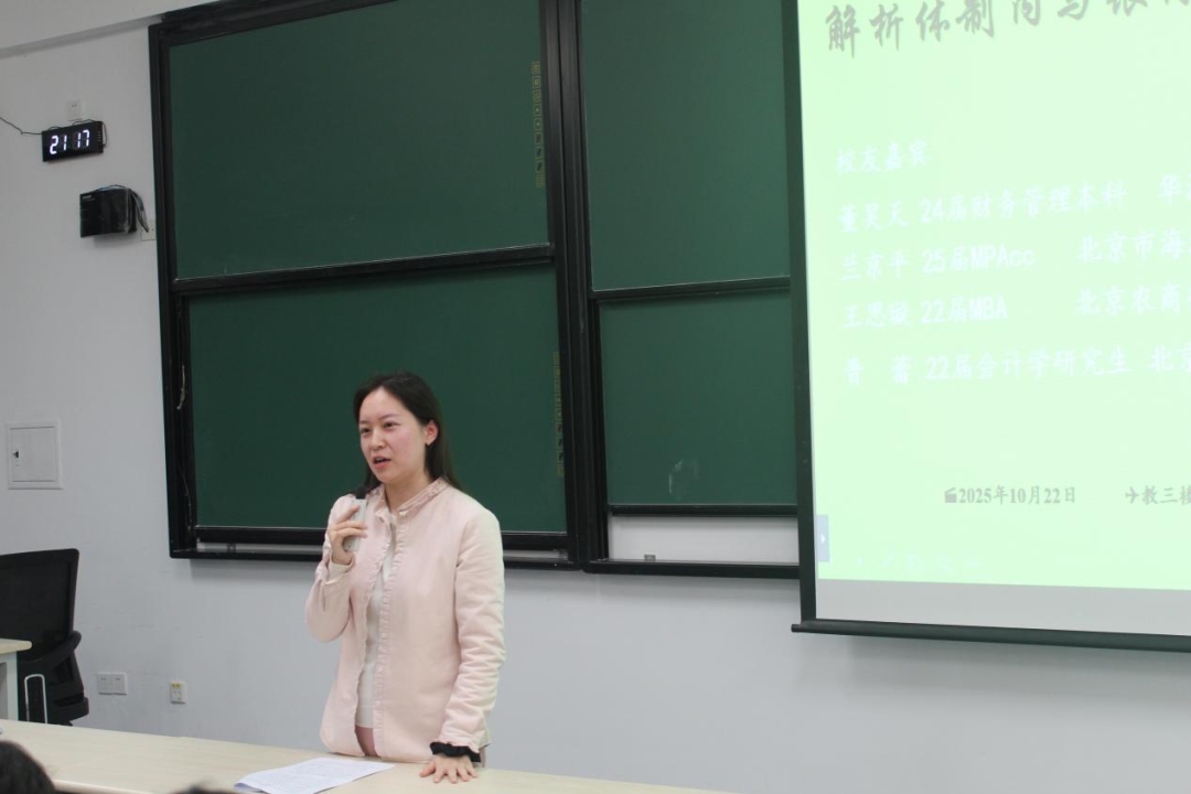 近日,为切实提升同学们就业竞争力、精准传递职业发展信息,日本A片 特邀请四位不同领域的优秀校友,举办了就业分享活动。四位校友嘉宾是:晋蕾,22届会计学硕士;王思璇,22届工商管理硕士,北京农商行总行;24届财务管理本科董昊天,华润医药集团;兰京平,25届会计专硕。线上线下共400多人参会。25级会计专硕孙艺甄同学主持。
