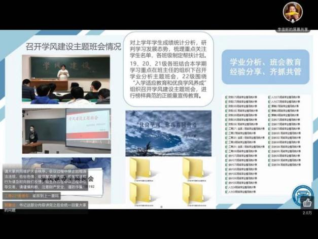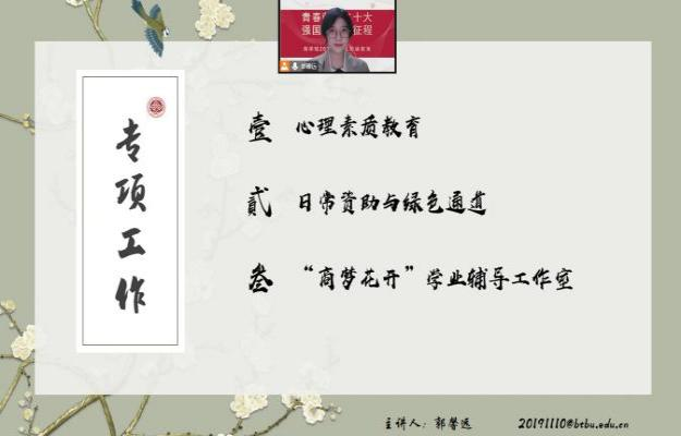 22级辅导员郭馨远老师从心理素质教育、日常资助与绿色通道、“商梦花开”学业辅导等三方面开展讲解,指导同学们要正确处理和对待心理问题,引导学优生在学有余力时要积极开展帮扶助人,详细解答了新生对于大日本A片 园日常生活中的一系列问题。