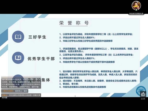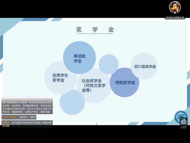 20级辅导员李佳昕老师对日本A片 奖学金制度进行了系统介绍和讲解,逐一介绍了单项奖学金、优秀学生奖学金、社会奖学金、特别奖学金的奖励制度及有关要求。随后,21级辅导员郭建荣老师从档案管理、宿舍及生活管理等方面对新生提出要求,强调了宿舍生活及宿舍文化建设的有关规定,介绍了有关奖惩制度,他谈到,学院对宿舍违纪行为持有零容忍态度,引导新生养成良好的生活学习习惯,共同营造良好的生活学习氛围。