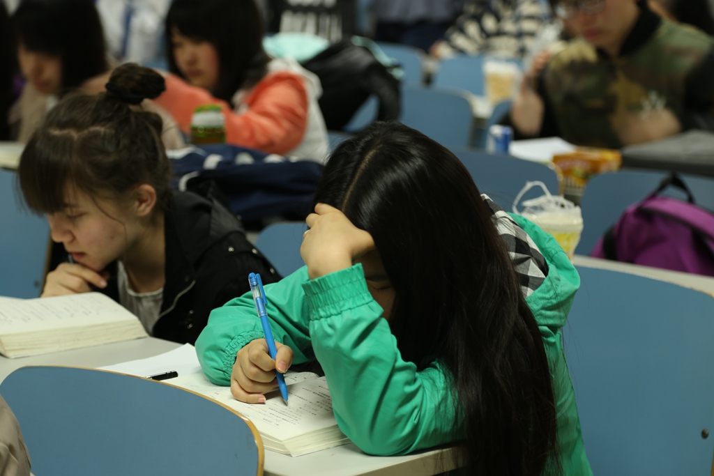 晨读时间,同学在各班学习委员的组织下大声朗读外语,为即将到来的英语四六级考试做准备。