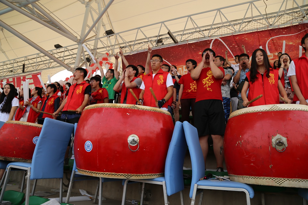 绿茵场上的健儿们奋力拼搏,看台上,学生组织系统的同学们敲打着大红鼓为同学们打拍子,观众们跟着节奏为运动员们加油喝彩。