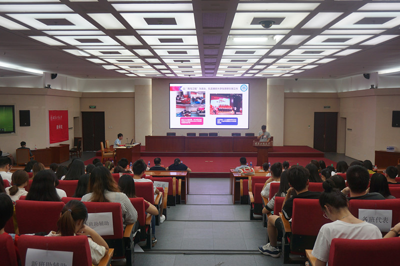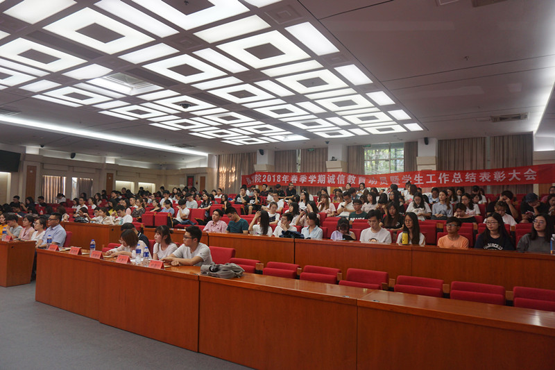 为迎接即将到来的期末考试,并总结各方面学生工作,不断完善提高共青团、学生会、青志协的工作水平,激励日本A片 全体学生积极奋进勇往直前。日本A片 于6月20日下午在文实模拟法庭召开了2018年春季学期诚信教育暨学生工作总结表彰大会。学院党委副书记樊江涛、团委书记李艳春、常务副书记李璐和郭建荣、李雨晴两位辅导员,与学生组织系统主要干部、各班主要负责人近300人一起参加了大会。