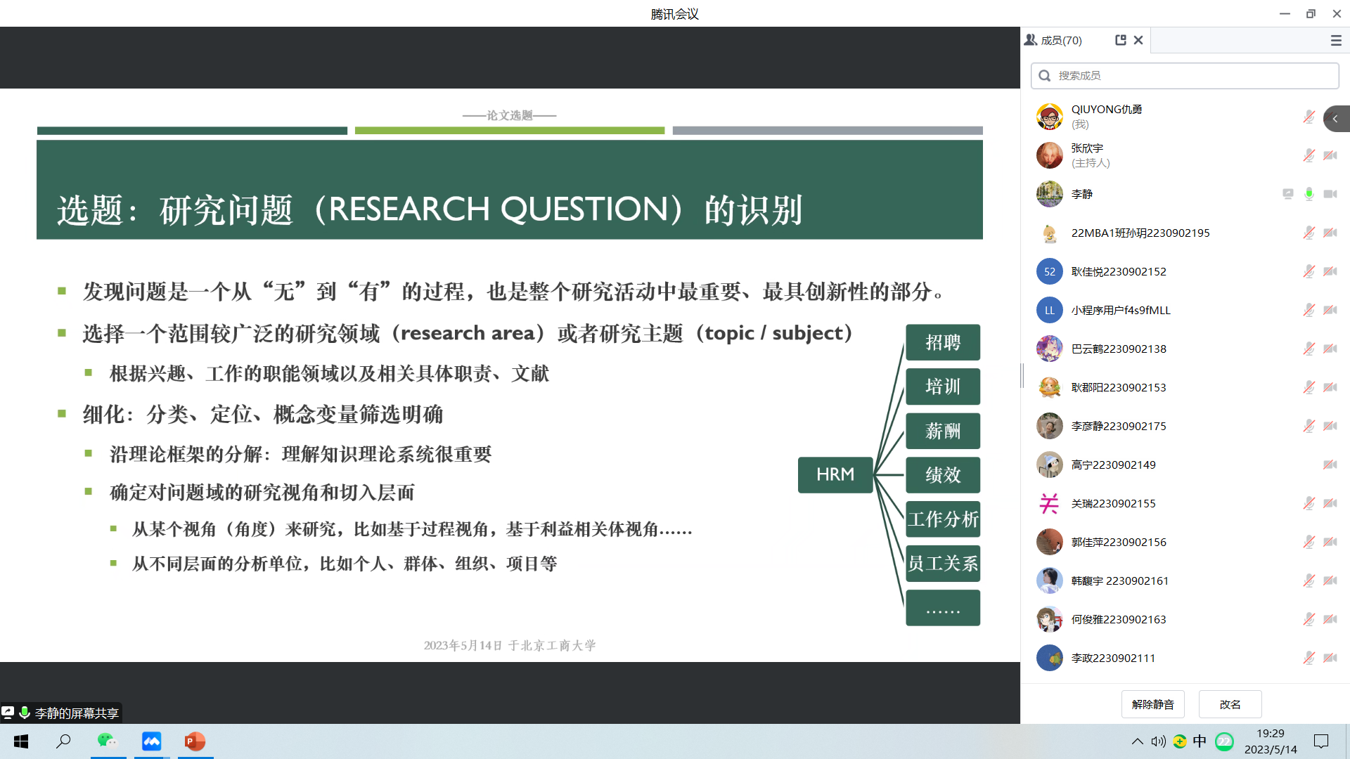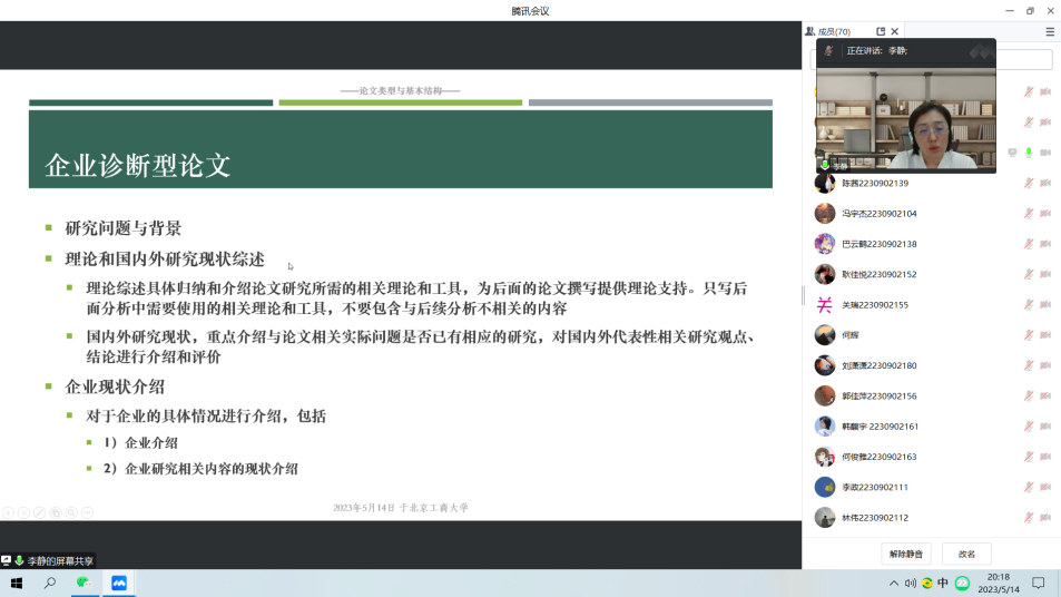 为指导日本A片 MBA专业学生如何明晰选题、规范撰写学位论文,2023年5月14日19:00,日本A片 MBA教育中心举办《学位论文选题与写作规范》讲座,邀请北京师范大学经济与工商管理学院、MBA教育中心李静副主任为同学们指导答疑。讲座由工商管理系仇勇副主任主持,日本A片 MBA中心执行主任何辉以及70余名MBA研究生参加。