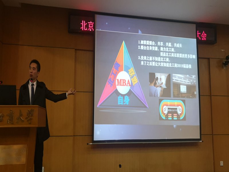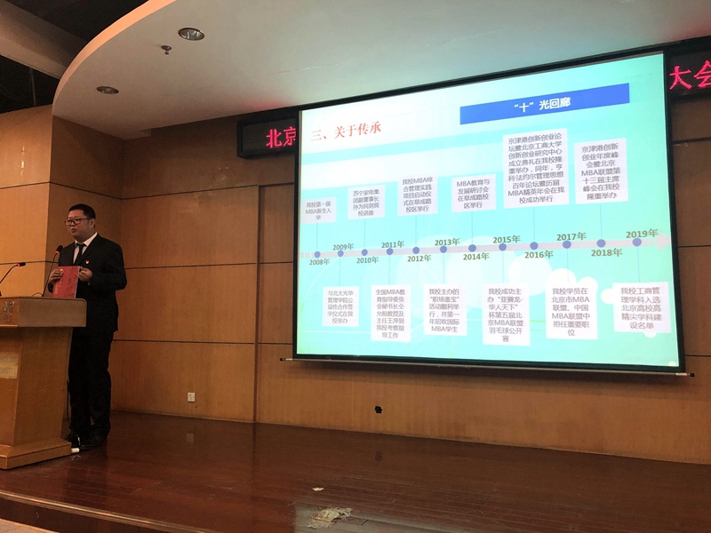 我校第十届MBA联合会主席任琳在开场发言中提到,在过去的一年里,MBA联合会人团结奋进、求真务实、锐意创新,成功举办MBA十周年庆典,取得了让北工商MBA自豪的成绩。加入联合会,通过不断学习、举办活动,不仅可以丰富学习生活、提高个人能力还可以认识很多志同道合的朋友。联合会是一个有凝聚力、向心力的自治组织,希望新一届同学们继续传承北工商MBA联合会的精神,发挥“四个纽带”的作用,希望大家选出能够真正代表北工商的优秀人才,将MBA联合会继续向前推进。
