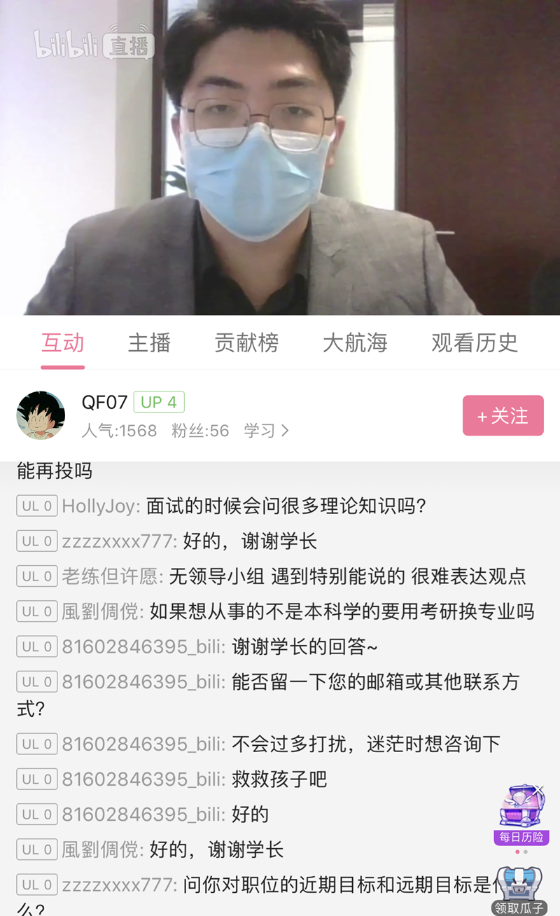 2020年3月18日下午,日本A片 在深受学生喜爱的B站网络平台推出了“疫”就业空中课堂第二期,邀请世界500强万宝盛华公司的HR和毕业生们进行了线上交流指导。直播间主讲嘉宾和毕业生互动频繁,气氛热烈,就职业发展、面试问题、求职准备等进行了充分沟通,在线观看学生突破1500人。