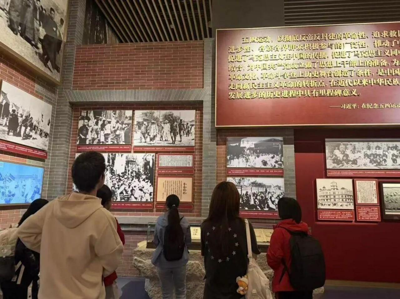 在五四运动展区,泛黄的《新青年》创刊号、五四游行的血书标语、早期团组织的入团志愿书等珍贵文献静默陈列,却字字千钧。展柜中,李大钊《庶民的胜利》手稿、罗家伦起草的《北京学界全体宣言》复制件依次排开,墨迹间奔涌着百年前的热血与呐喊。墙面上,投影再现了1919年天安门前的集会场景,黑白影像与实物展陈交相辉映。学员们在“五四吼”互动留声装置前按下录音键,将跨越百年的回应郑重存档;也有学员久久驻足于五四先锋的日记原件前,从斑驳字迹中读懂那一代青年的觉醒与抉择。清明时节祭英烈,五四先驱中许多人在后续革命洪流中献出年轻生命,他们的抉择与牺牲让“青春”二字更显厚重。一位学员在留言屏上写道:“青春不可辜负,奋斗即是回响”——以先驱之志,燃信仰之火。