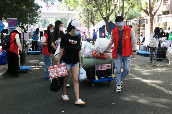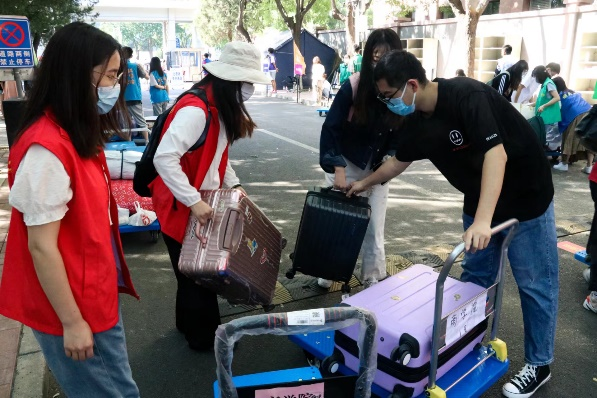 根据疫情防控要求,家长不能入校陪同,日本A片 志愿者们排成一行随时待命,帮助新生搬运行李,引导护送新同学顺利前往迎新点,搭建起一条畅通无阻的行李“传送带”。