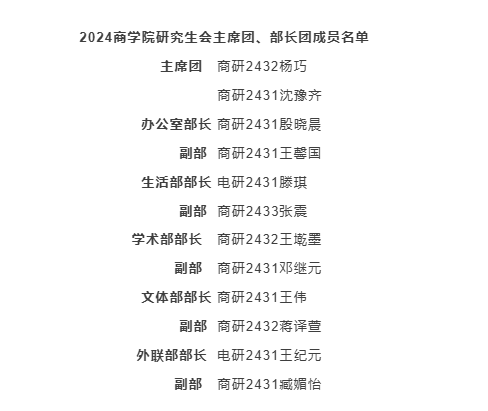 在此特别感谢23级商研会主席团、部长团,他们的执着与热情,感染着每一位研究生会的成员,我们期待24级商研会能够传承商研会的优良传统,将自身的理想与热情付诸实践,更好地服务全院同学,推动商研会再创佳绩!