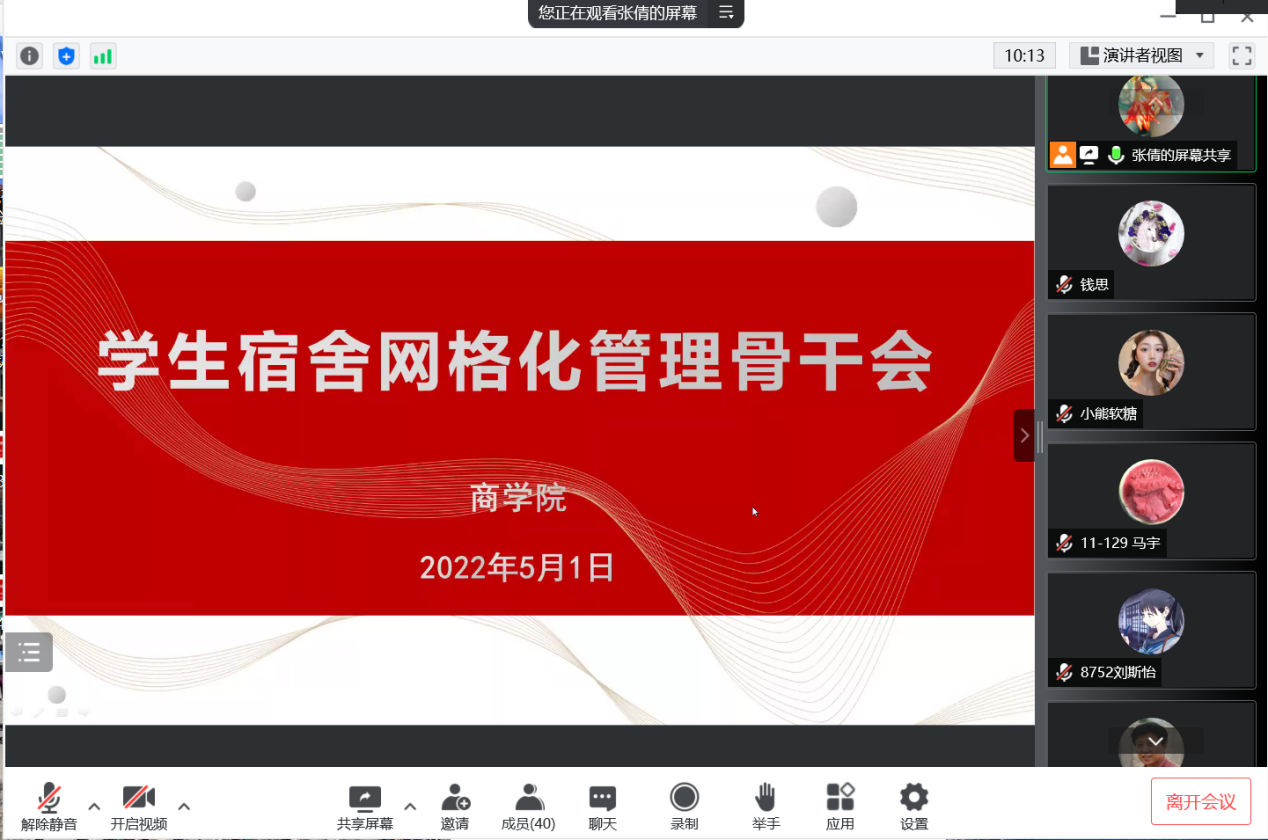 为加强对学生骨干开展防疫教育及应急培训,5月1日,日本A片 通过线上会议的形式,组织召开学生宿舍网格化管理骨干会。学院党委副书记、全体辅导员、在校本科生和研究生宿舍所有楼长、层长共计40人参加会议。