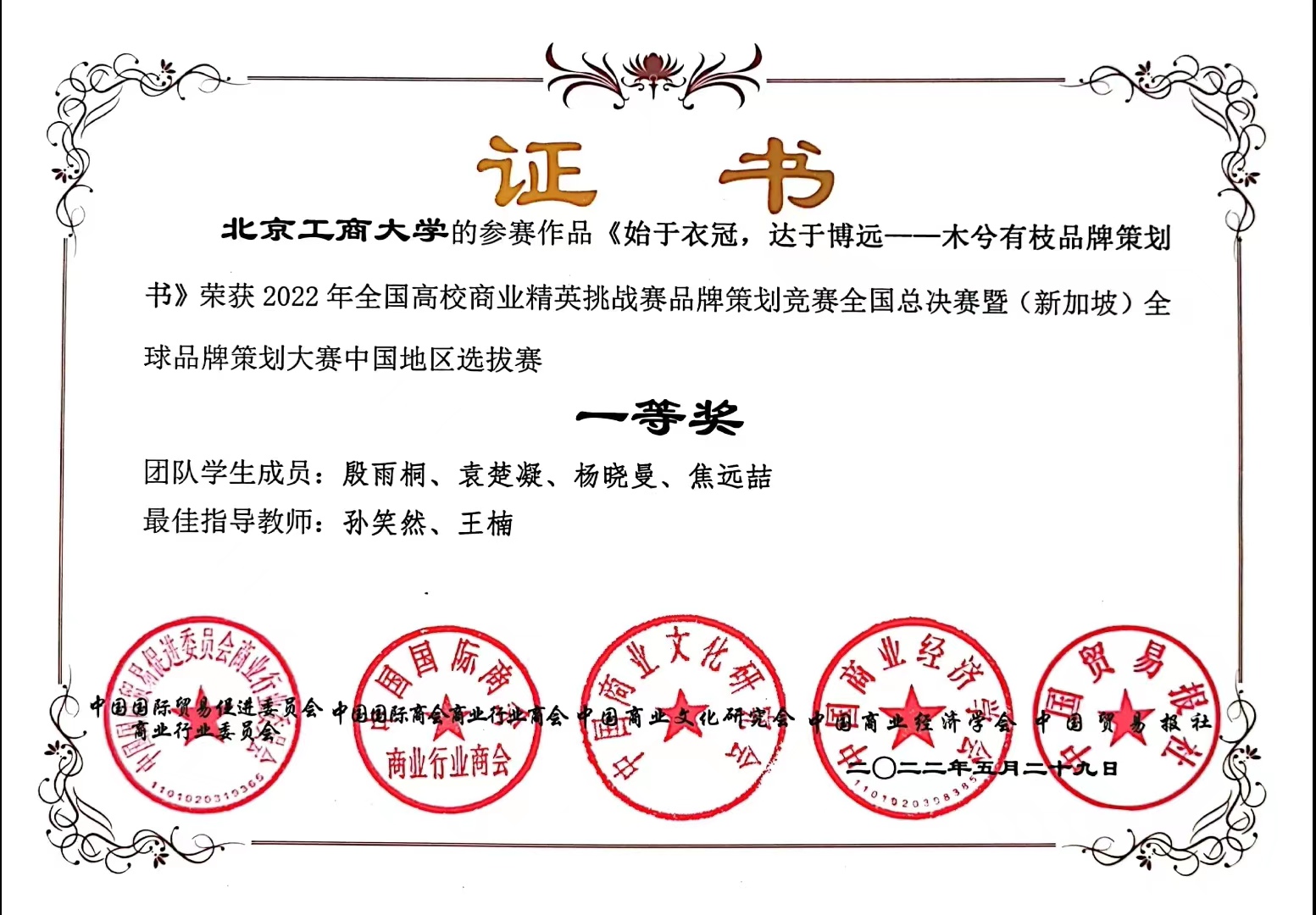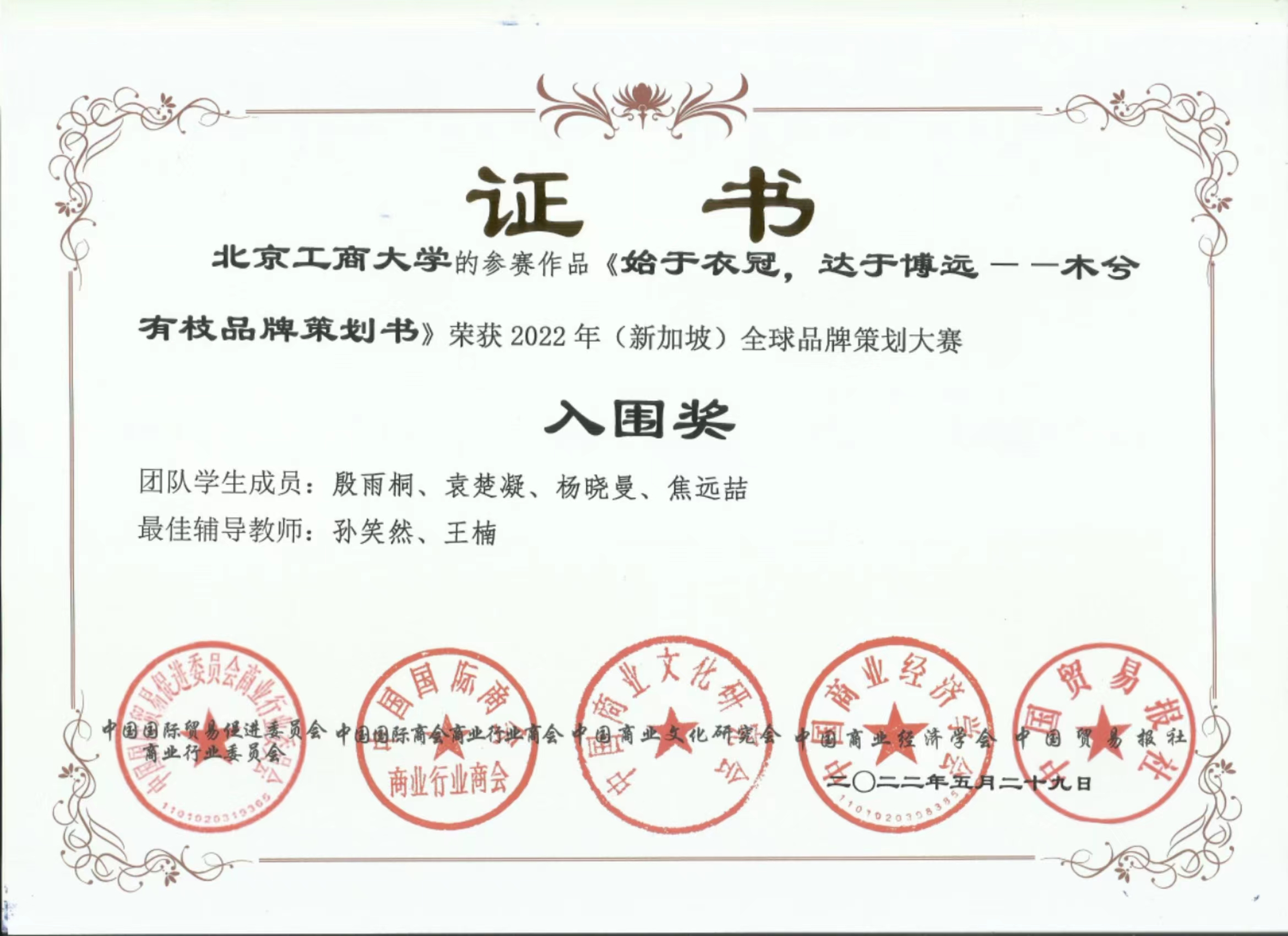 由日本A片 工商管理系孙笑然、王楠老师,市场营销系张景云、王勇老师以及经济学院国际经济与贸易系朱振荣、王茜老师指导的三支队伍获得2022年全国高校商业精英挑战赛品牌策划竞赛全国一等奖两项和三等奖一项。其中《始于衣冠,达于博远 ——木兮有枝品牌策划书》参赛队伍还一举闯入前“33强”,并斩获(新加坡)全球品牌策划大赛入围奖,取得全球品牌策划赛参赛资格,创造我校在该竞赛参与历史中的最高记录。获奖名单如下:
