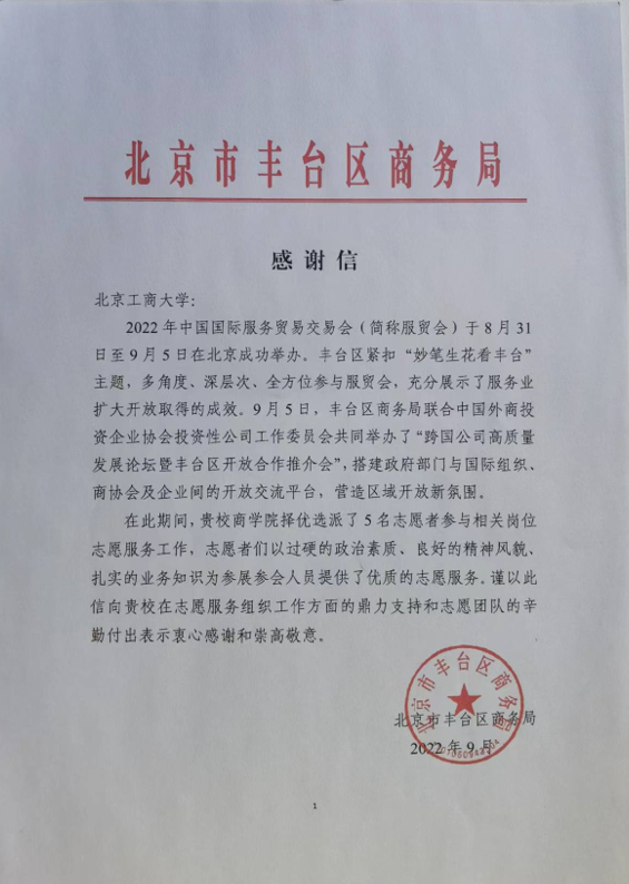 2022年9月10日,我校收到北京市丰台区商务局发来的感谢信,对日本A片 学生在2022年中国国际服务贸易交易会活动中的贡献表达感谢。