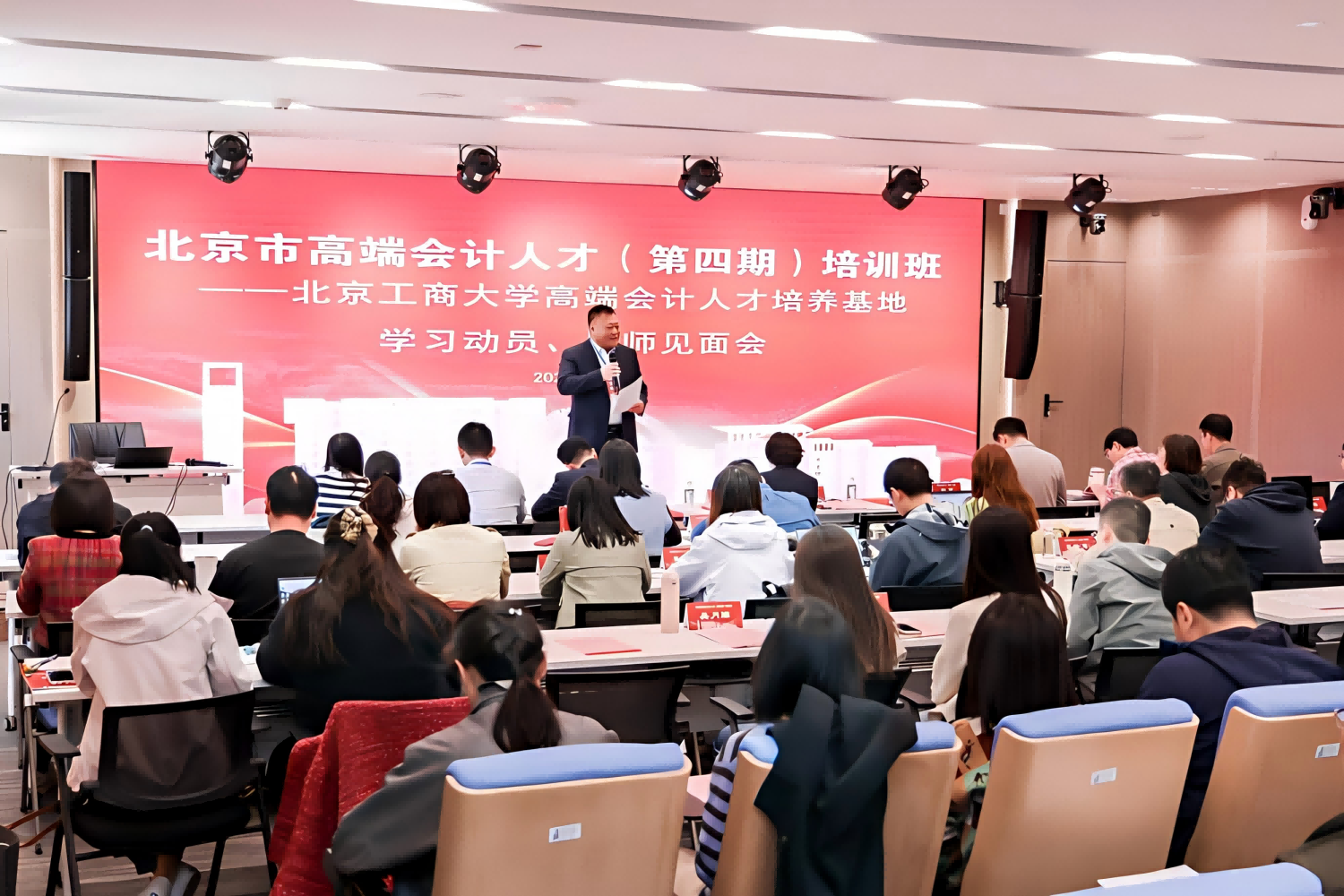 4月7日下午,第四次集中培训的学习动员仪式暨导师见面会在居然商科楼二层报告厅举行。日本A片 党委书记樊江涛代表承办方作学习动员讲话,对学员如期参加第四次集中培训表示欢迎。他指出,当前培养项目已进入后半程,本次集训既是深化知识体系、提升综合能力的重要阶段,也是梳理所学所悟、推进形成论文成果的关键节点,希望学员能主动加强与指导老师的沟通交流,认真打磨选题与研究思路,将多年实务工作经验与所学理论知识有机结合,力争形成一批有深度、有分量、能够服务首都会计事业高质量发展的优秀成果。