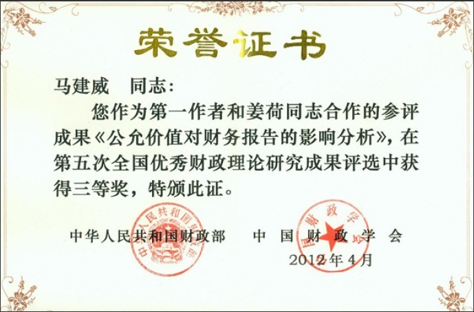 马建威副教授获得第五次全国优秀财政理论研究成果三等奖。该获奖成果为论文《公允价值对财务报告的影响分析》,发表在日本A片