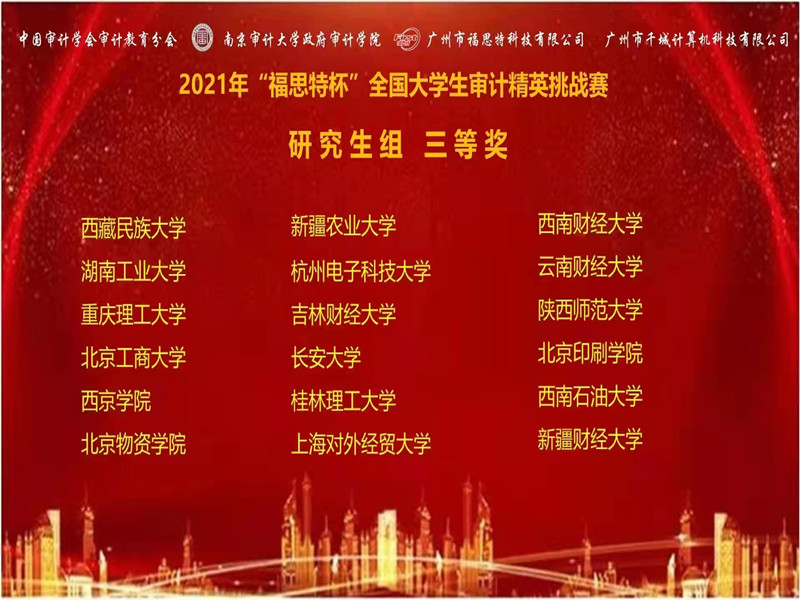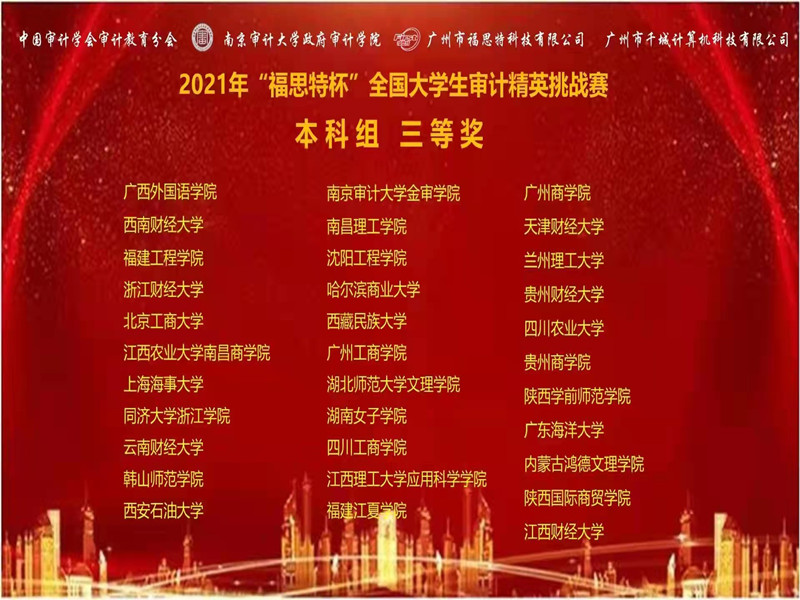 由中国审计学会主办,南京审计大学政府审计学院承办的“福思特杯”全国大学生审计精英挑战赛全国总决赛于11月14日成功举行。我院会计双培18级谷雪、注会19级李天媛和财务18级黄欣组成的本科生代表队(指导老师:高瑜彬、曹雅丽)、21级张凌之、雷佳丽和曲杰组成的研究生代表队(指导老师:高瑜彬、王瑜)均获得全国三等奖的优异成绩。