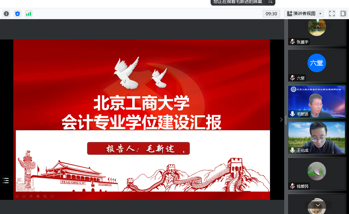 然后,毛新述教授从学位点基本情况、师资团队、招生与就业、培养方案设置、实践基地、社会服务特色与优势等方面对学院会计专业学位建设情况进行汇报,并详细介绍了会计专业博士学位建设规划。