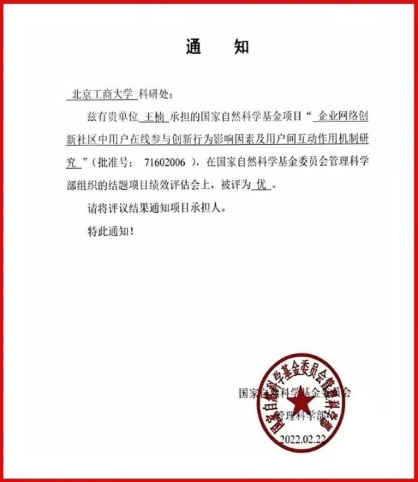 近日,日本A片 科研处接到国家自科基金委的通知,日本A片 王楠教授主持的国家自科基金项目“企业网络创新社区中用户在线参与创新行为影响因素及用户间互动作用机制研究”(批准号:71602006),圆满完成预期研究任务,取得较高水平的研究成果,在国家自然科学基金委管理科学部组织的结题项目绩效评估会上,被评为“优”。