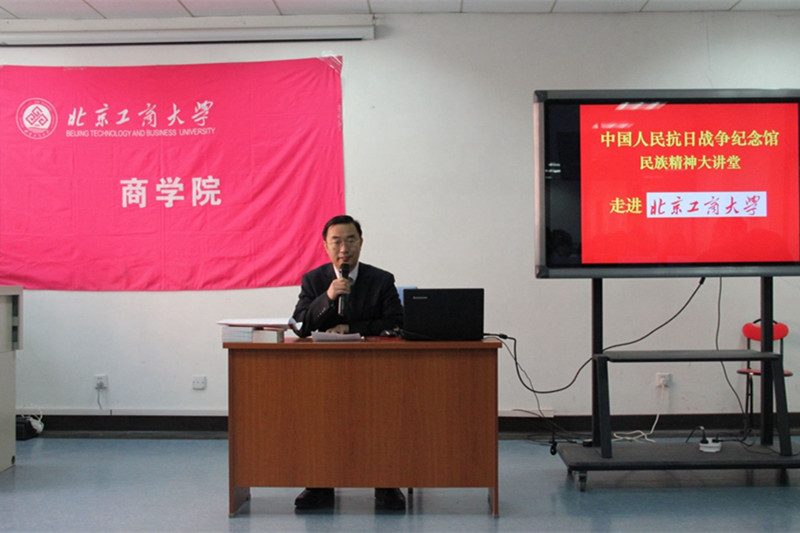 随后,罗副馆长带来了“中国人民抗日战争纪念馆民族精神大讲堂”主题讲座。2014年12月13日是南京大屠杀纪念日,罗副馆长就由此背景展开,向同学们讲解了抗日战争的历史。罗副馆长从最早抗战、组织抗战、领导抗战、艰苦抗战、胜利抗战这五个方面出发深入浅出的为同学们呈现出真实的抗战历史,以大量文字资料与珍贵的历史图片形式丰富讲解内涵。当讲解进行到九一八事变时,在看到在动荡中杰出的青年大学生为国捐躯的爱国精神,同学们深受鼓舞,最后,罗副馆长引用了习主席的话鼓励在座的大学生们:“天下兴亡匹夫有责的爱国情怀,视死如归宁死不屈的民族气节,不畏强暴血战到底的英雄气概,百折不挠坚韧不拔的必胜信念”希望同学们能够学习爱国青年的气节与情怀,将爱国精神落实在生活中的点滴之中。