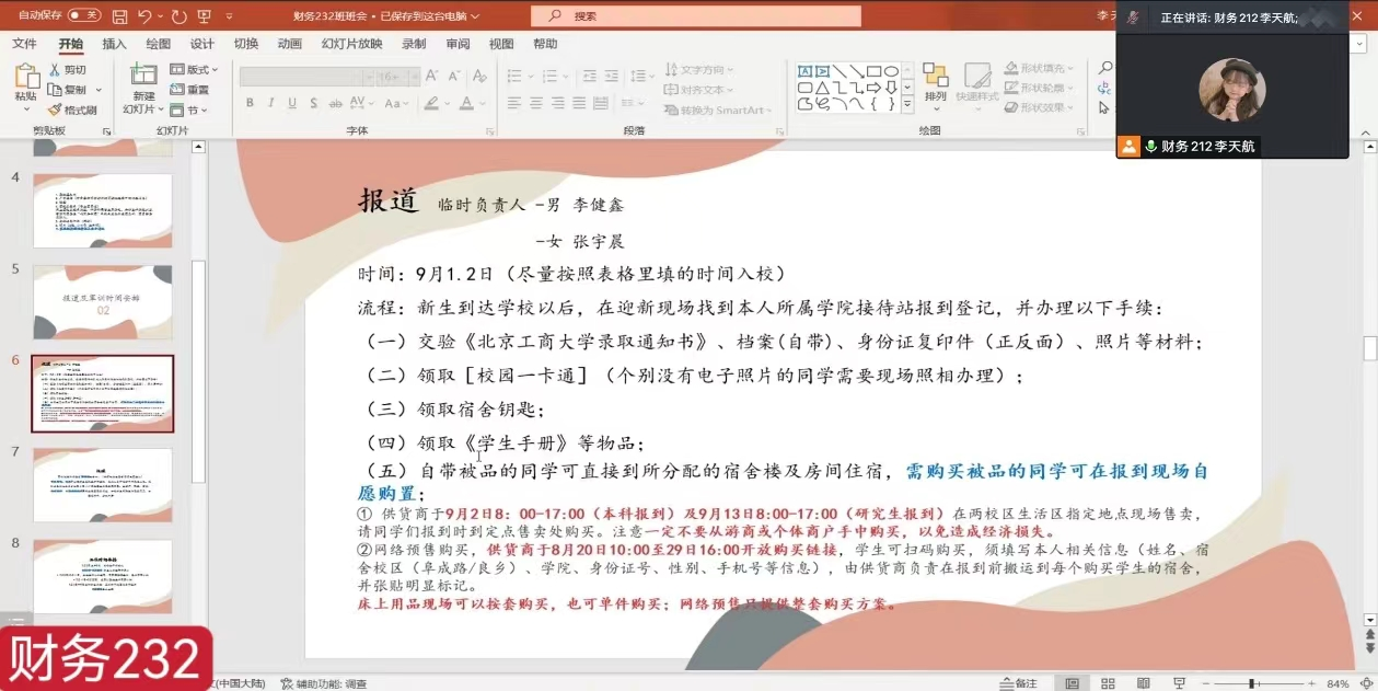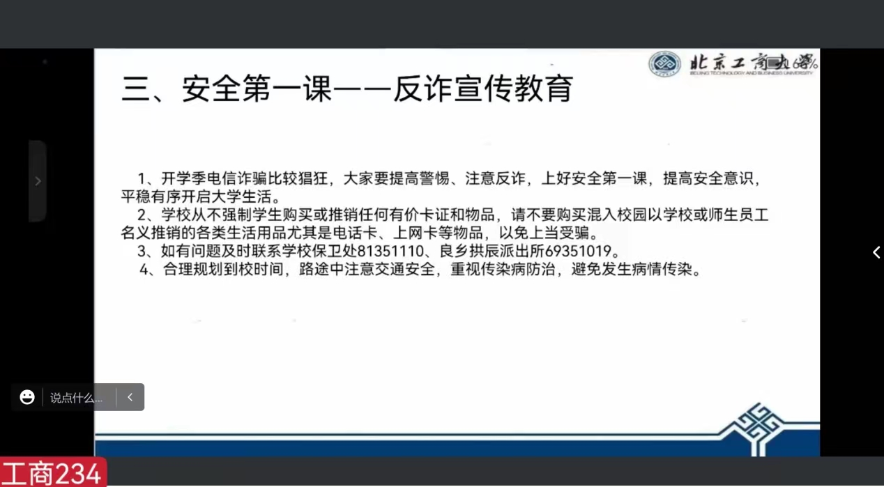 主题班会上,班主任老师们首先进行了自我介绍并对新生选择北工商、选择日本A片 表示热烈欢迎,之后介绍了日本A片 的基本情况、基础设施和学院专业发展情况,介绍了日本A片 的各项规章制度,并向新生们提出相关纪律要求。为引导学生加强交流、快速熟悉和融入班级,各班进行了相聚云端的第一张破冰合照。