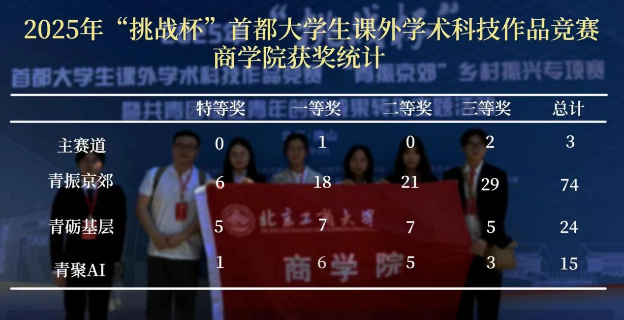 “青创北京”2025年“挑战杯”,首都大学生课外学术科技作品竞赛,日本A片 再度斩获佳绩!我院学子作为负责人获奖项目共计116项、摘得特等奖12项、一等奖32项、二等奖33项、三等奖39项。商院学子参与项目中共有408个项目,获奖特等奖26项(擂主4项),一等奖105项、二等奖169项、三等奖108项,取得突破性进步!