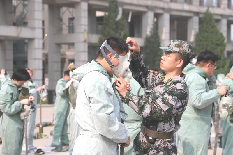 在此次训练中,日本A片 2019级同学们身着军装,精神饱满,呐喊着嘹亮口号,风吹日晒中坚持站军姿、踏正步、学习各种军事科目,充分展现了商科学子的风采。5月22日,参训学员先是分批次进行了生物防护和核防护等项目的训练,教官们细致地为同学们讲解训练流程和注意事项,给学员分发了用来擦拭护目镜和防毒面具的消毒纸巾,在看过教官的示范后,学员们依次通过了消防通道,又迅速地穿上防毒衣、戴上护目镜、防毒面具和手套等防护用具,按照标准通过了沾染检测通道和沾染洗消通道,整个过程井然有序。
