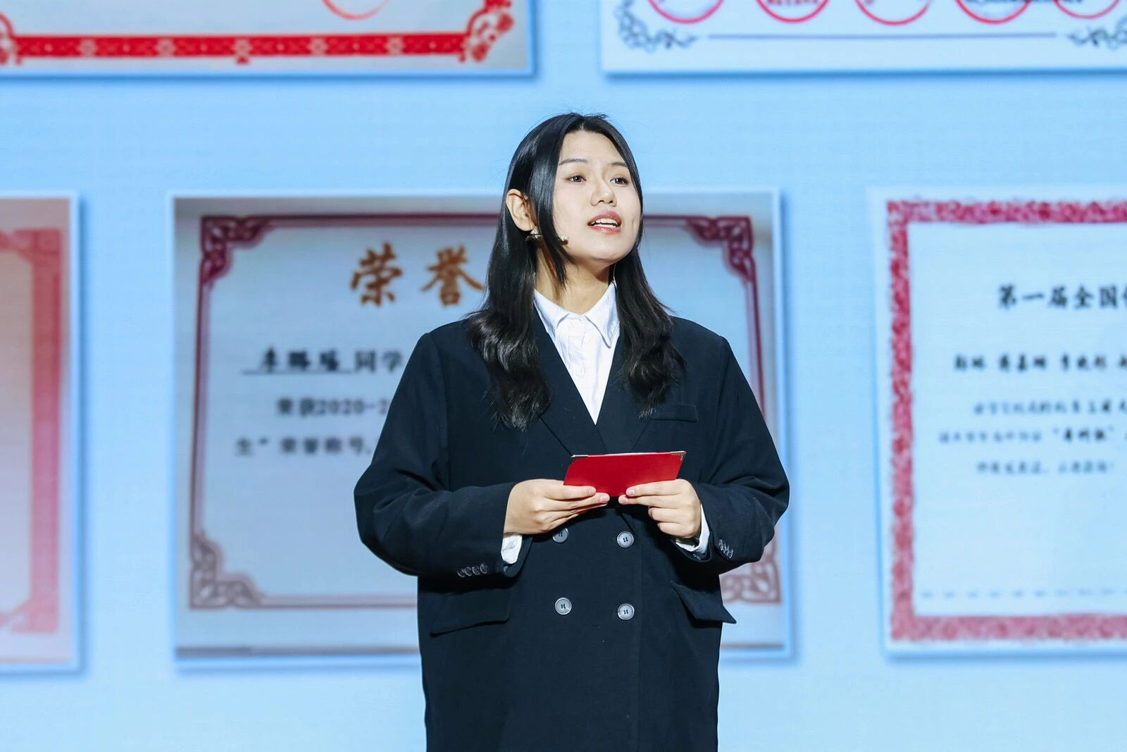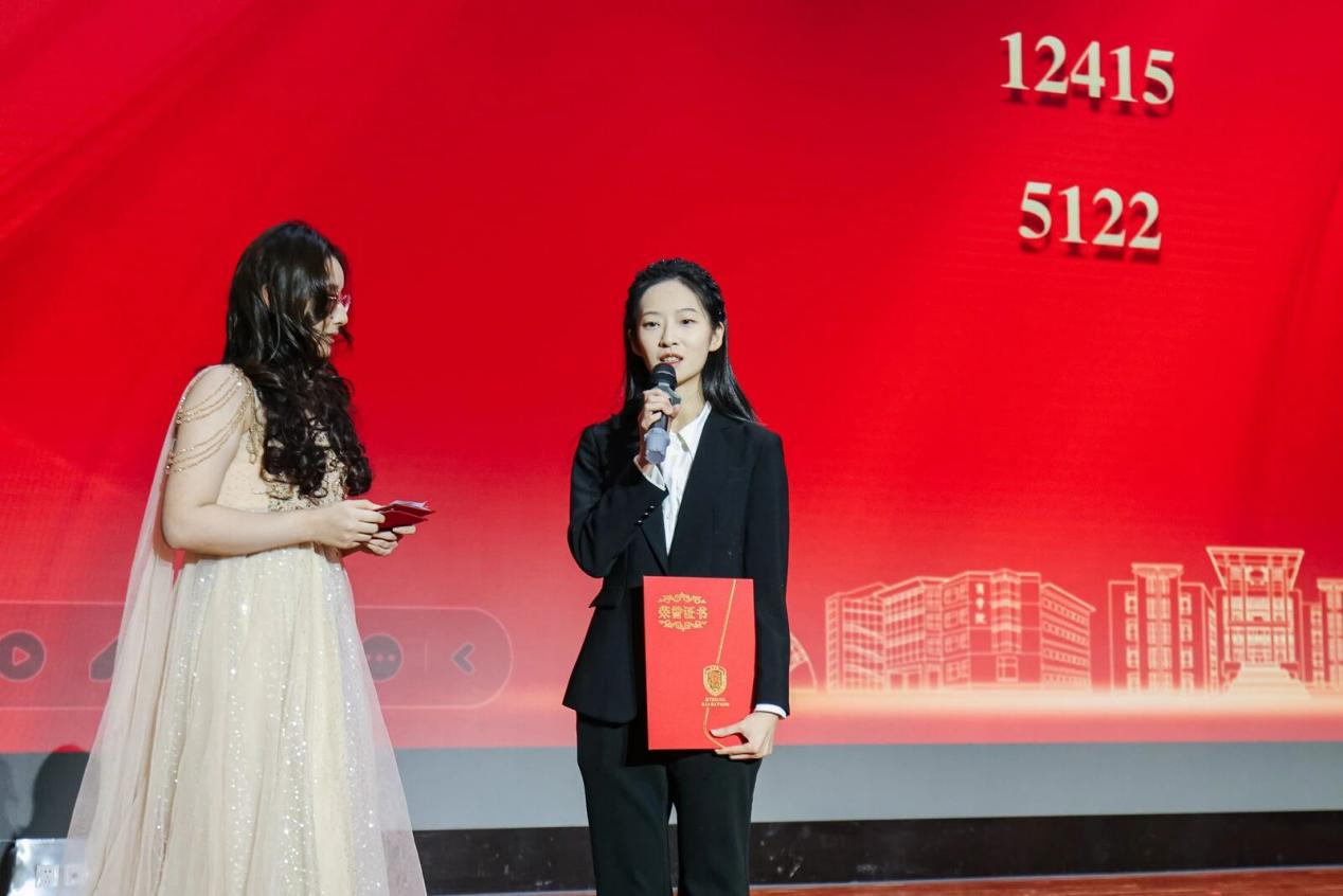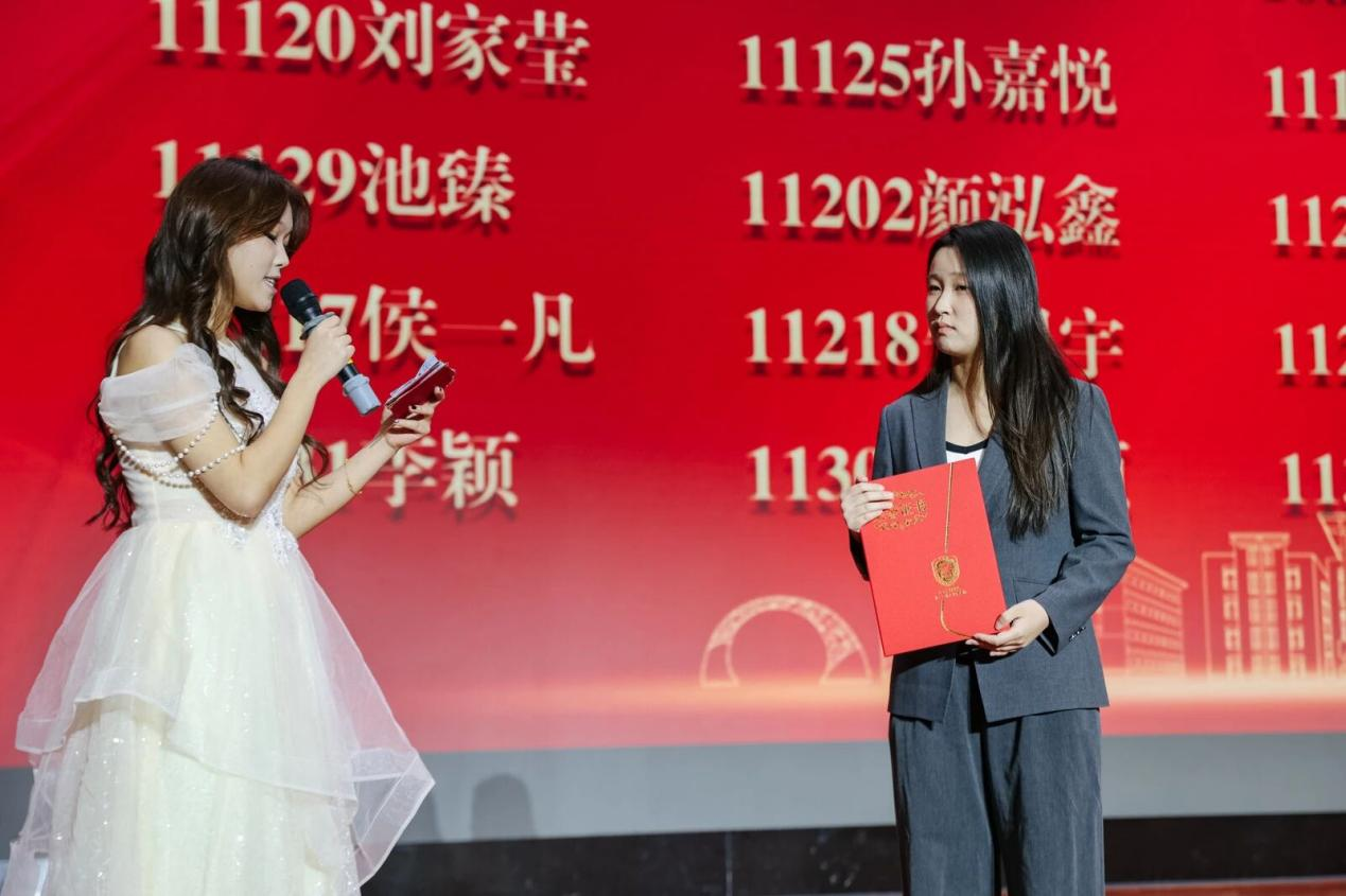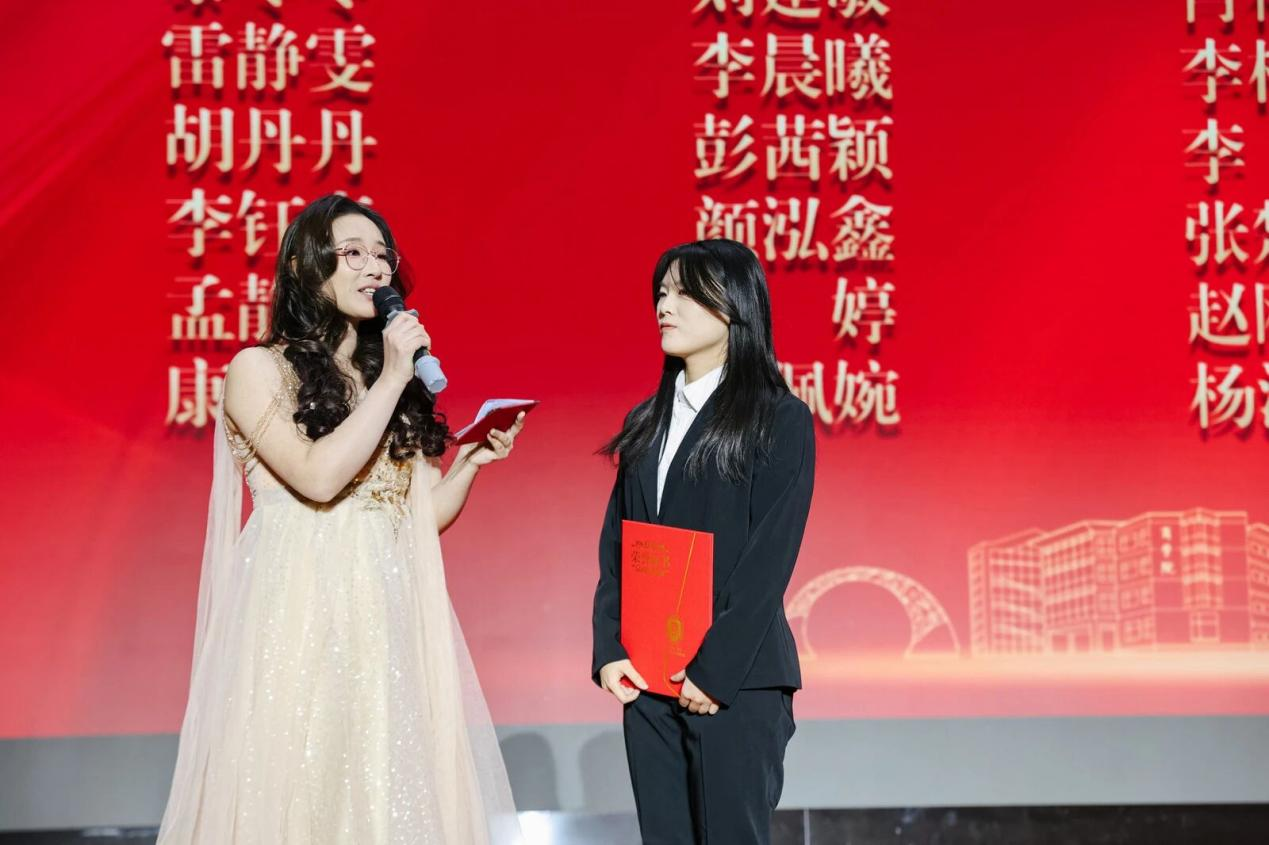 校团委书记单紫薇为各类奖学金获奖者代表颁奖。