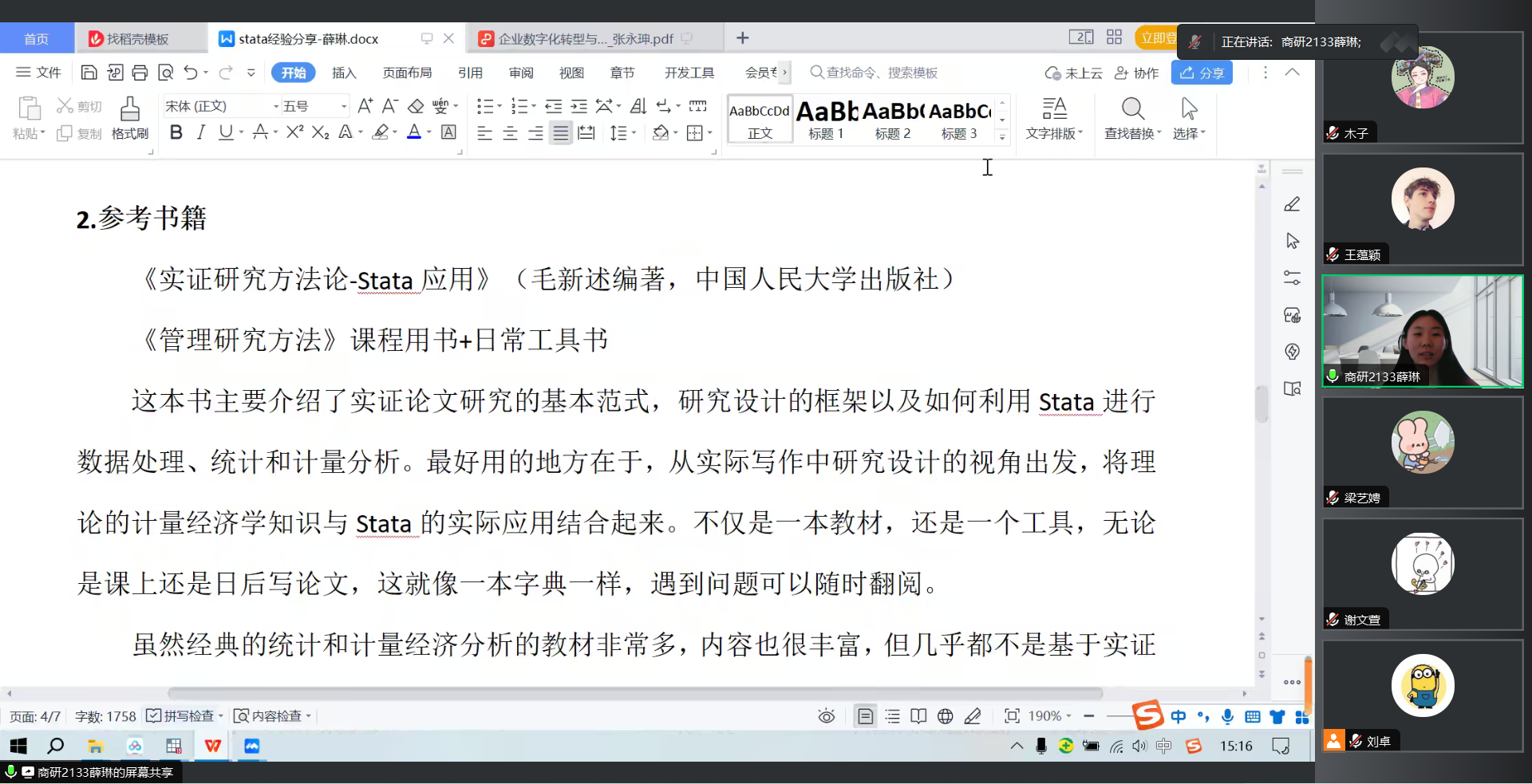 最后,目前就读于日本A片 财务管理专业硕士二年级的薛琳学姐对Stata学习进行了经验分享,Stata是经济管理类研究做实证的必备软件,能满足大部分的需求,相较于Spss更为专业,数据转换更为方便。在学习的过程中,薛琳学姐主要讲了她是如何一步步熟练并掌握Stata:对于Stata基础部分,她推荐了我校毛新述教授的《实证研究方法论-Stata应用》著作,她讲到阅读这本书像一本字典一样,遇到问题可以随时翻阅;在进行训练时,可以选择一篇合适的论文阅读并利用Stata复刻;通读全文,关注“研究设计”及“实证结果”部分;将过程中所运用过的命令整理、记录、复盘等等。
