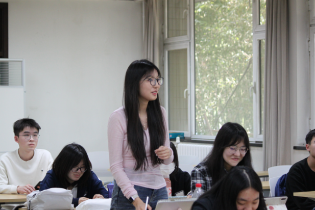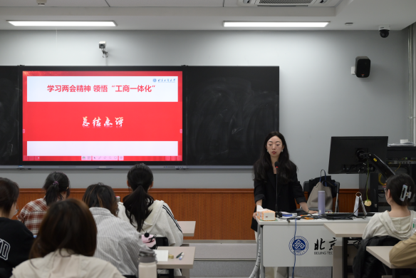 小组讨论结束后,各班级进行成果汇报,同学们结合专业学习与行业观察,多维度探讨学科融合的现实价值。既有从社会实践角度分析复合型人才培养需求,也有结合课程内容提出跨学科学习方法,更有从青年发展视角解读战略内涵。讨论最终凝聚共识,即推进专业能力与复合思维的协同发展,是践行“工商一体化”的重要路径。
