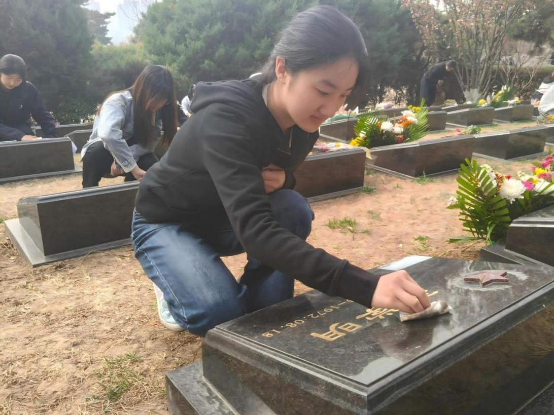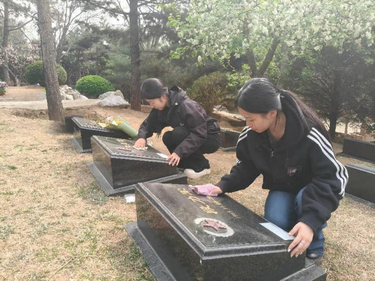 师生们手持清扫工具擦拭墓碑、维护陵园环境,以实际行动告慰先烈英灵。