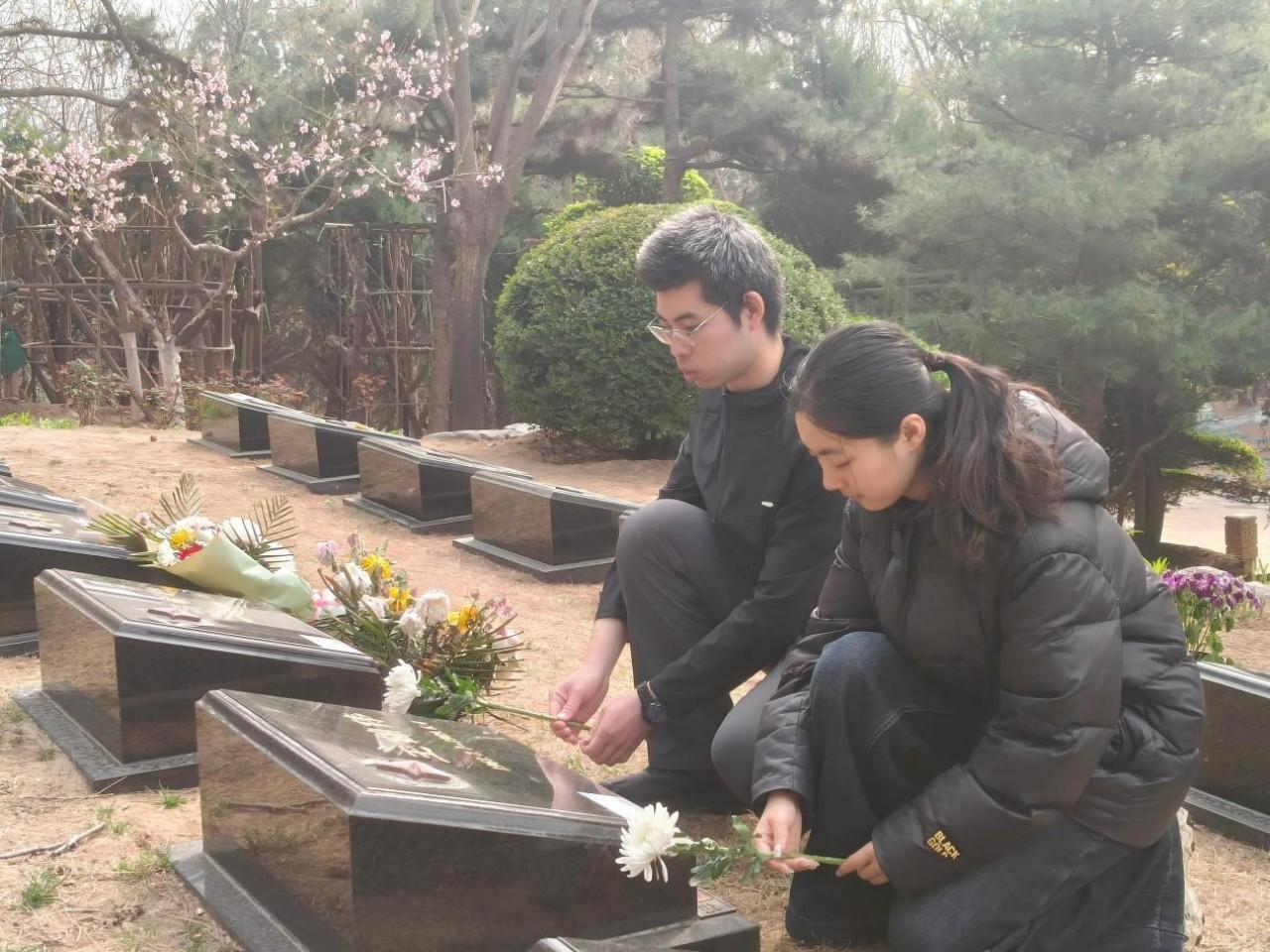 在烈士墓前,学生代表依次上前敬献白花,朵朵白菊承载着青年学子对先烈的无限追思。