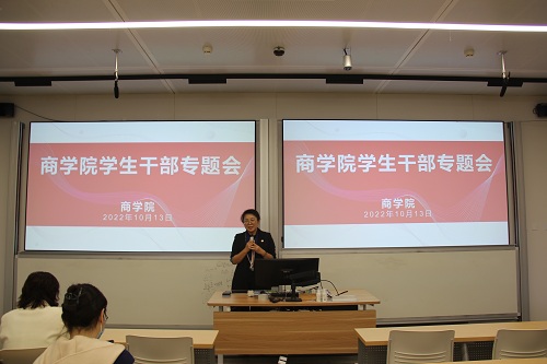 专题会上,学院党委副书记张倩对近期严峻复杂的防疫形势进行了介绍和分析,对近期学生宿舍及防火安全、交通安全、财产安全、反诈等进行提示,对学院进一步加强学风建设提出了更高的要求。她对学生干部如何做好学生工作、如何在奉献中不断成长和进步提出了三点希望:一是应切实履行作为学生骨干的责任,面向全体商院学子切实发挥正面导向作用,引导各班学生树立“我的商院我的家”的集体荣誉感和归属感。二是学会沟通反馈、做好学生和学院之间的桥梁纽带。三是要有奉献意识、大局意识、主人翁意识。会上,对近期个别学生违反防疫规定、不遵守校规校纪等情况进行了通报,引导学生要明辨是否、恪守底线,自觉遵守请假制度,积极响应核酸清零行动,严格自律遵守校规校纪。