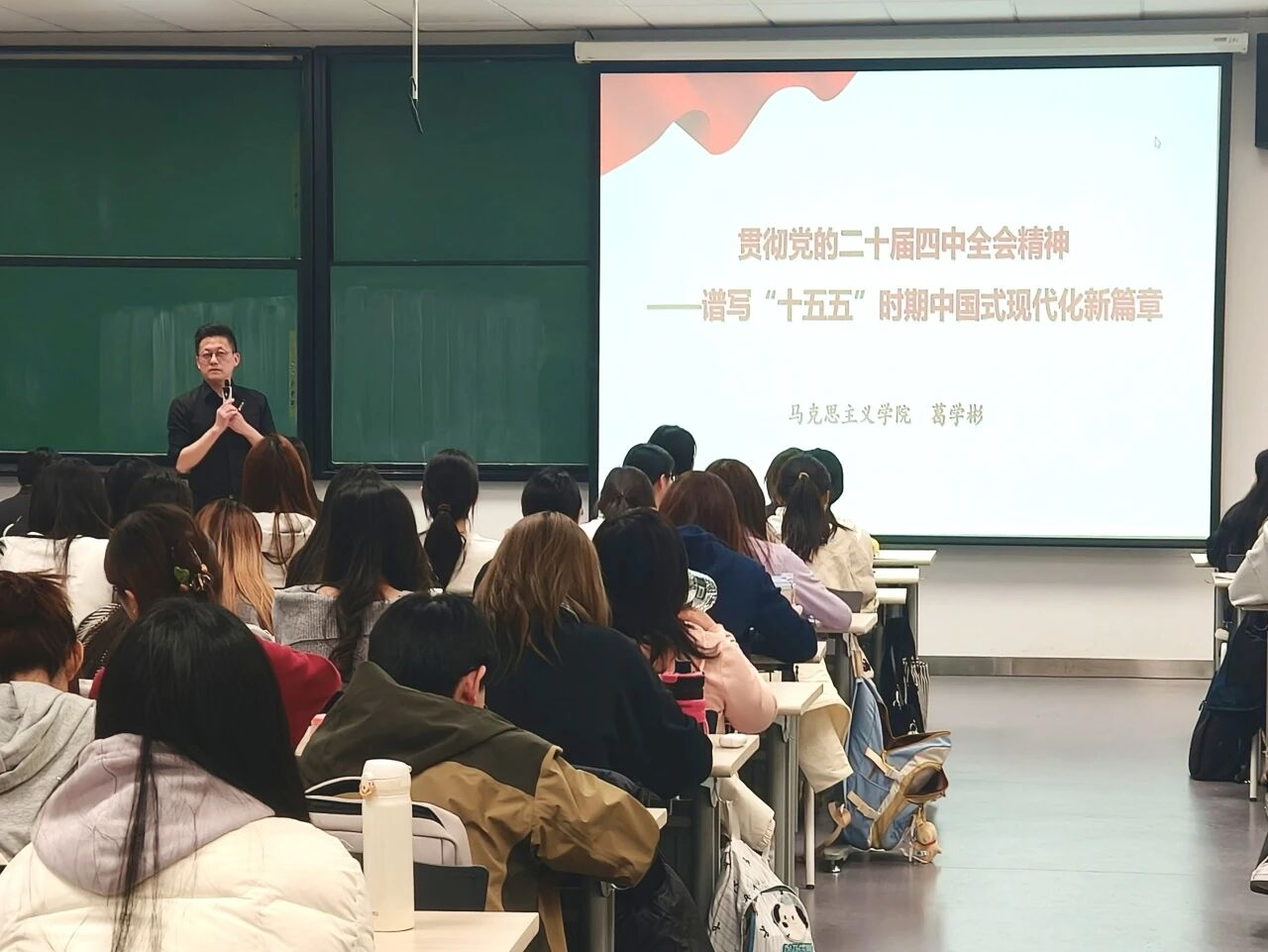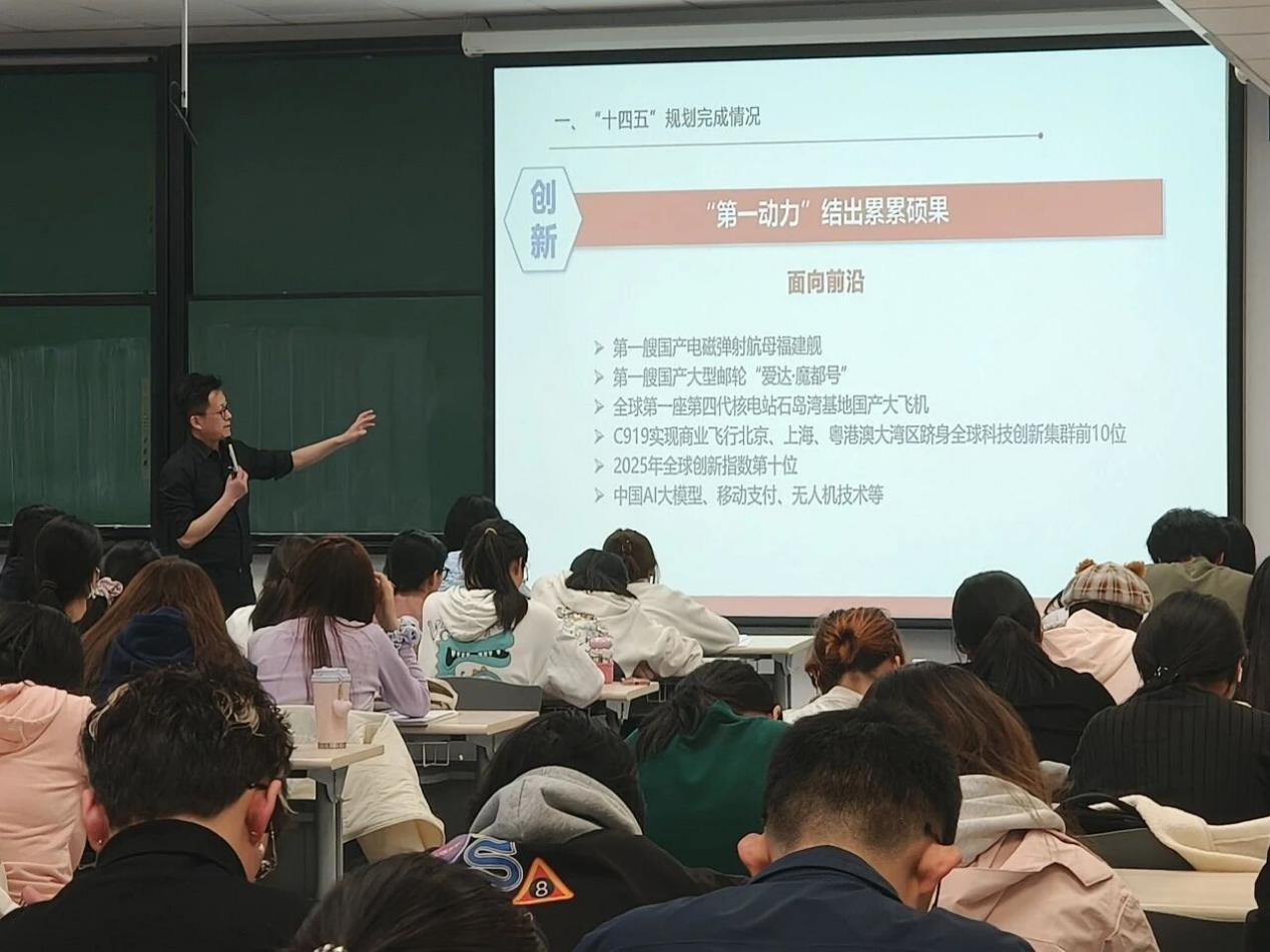 葛学彬老师紧扣全会精神核心要义,结合青年成长实际,从回顾成就、形势研判、目标擘画、青年担当四个维度,为学员带来了一场逻辑清晰、内容详实的专题宣讲。在回顾成就环节,葛老师从经济、科技、民生等宏观视角出发,全面复盘了“十四五”规划期间的辉煌跨越。他以C919大飞机商业首航、国产大邮轮出海等标志性事件为例,生动诠释了科技自立自强的强劲势头;结合医保异地结算惠及亿万群众、绿色家电走进千家万户等鲜活数据,深刻阐释“发展为了人民”的厚重内涵,让学员们切实感受到国家发展的坚实底气。