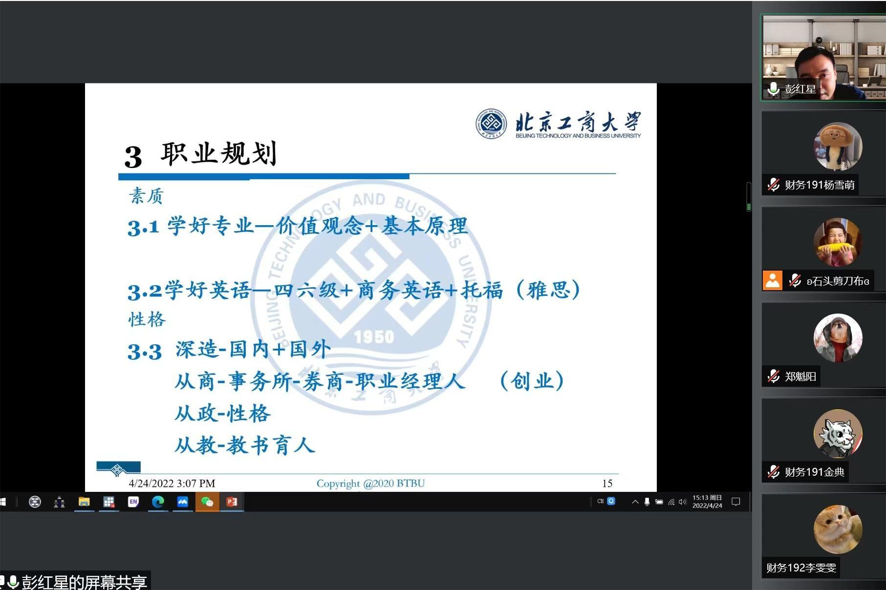 会计系彭斐老师作为新入职北京工商大学的优秀青年教师,以“人生不是轨道,是原野”为主题,通过分享她本人的毕业求职经历,从职业可选路径、如何选择就业行业、如何提升自身技能、如何看待行业发展等四个方面入手,为同学们详细介绍了近几年的会计专业毕业生就业形势,以及如何在当前社会背景下找到自己的立足之地。彭老师希望同学们可以把就业放到人生维度去考虑,顺应时代发展,做好时间规划、不断学习,既要不断提升自我竞争度,也要放平心态、学会排解焦虑情绪。