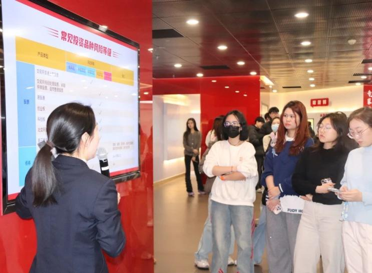 同学们在产品区、理念区、投资者保护区及模拟体验区直观认识了各种股票、债券等投资产品,大家对金融工具的风险性有了全新的认知。在丁老师的讲解下,同学们学习到各种金融工具的特点、投资理念、投资原则、投资者性格匹配等。