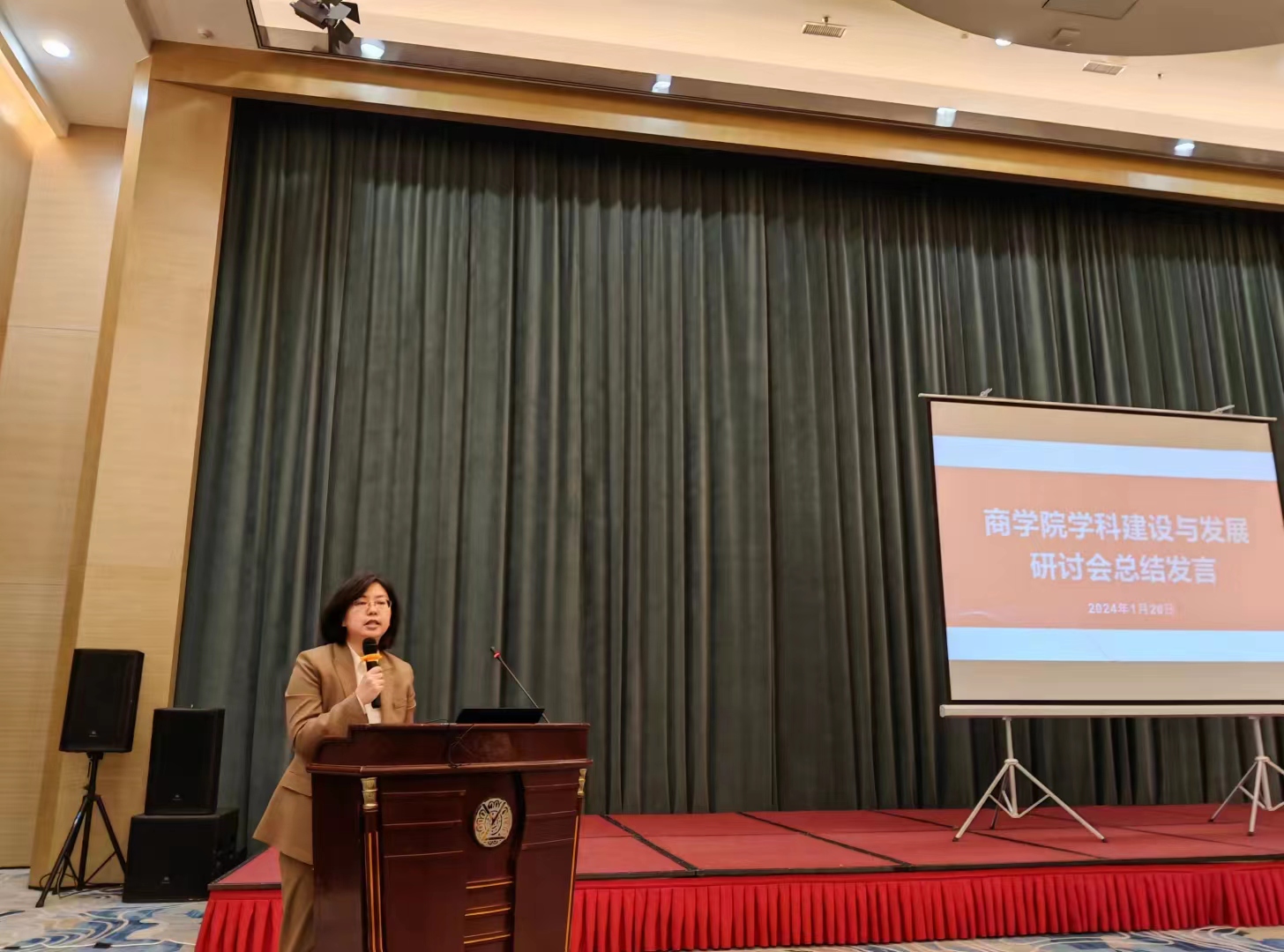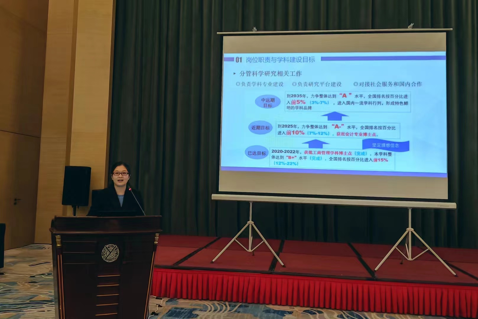 院长何玉润教授就“踔厉奋发,携手共进,建设高水平研究型学院”为主题展开了学科建设和发展规划的具体汇报,她表示人才队伍建设是第一要务,加强健全学院信息化建设是基础,招生就业两手抓是重要途径,全方位多层次的建设与发展才能共同绘就商院未来美好蓝图。