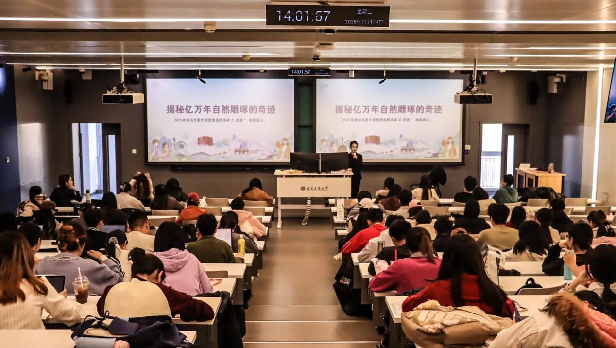 11月19日,中国房山世界地质公园博物馆金牌讲解员刘双琦以《《揭秘亿万年自然雕琢的奇迹》为主题,为百余名学子开启了一场探索地球演化密码的奇妙旅程。90分钟的沉浸式课堂里,大自然亿万年的鬼斧神工通过专业讲解徐徐展开,让在场学子深切感受房山地质地貌的独特魅力。讲师以地质时间线为脉络,从数十亿年前的古老岩层溯源,带领同学们领略喀斯特峰林的雄奇、地下溶洞的奇幻、高山草甸的辽阔,系统呈现房山几乎完整记录地球演化全过程的独特优势。丰富的地质样本图片、生动的地貌形成原理讲解,让抽象的地质知识变得直观易懂。