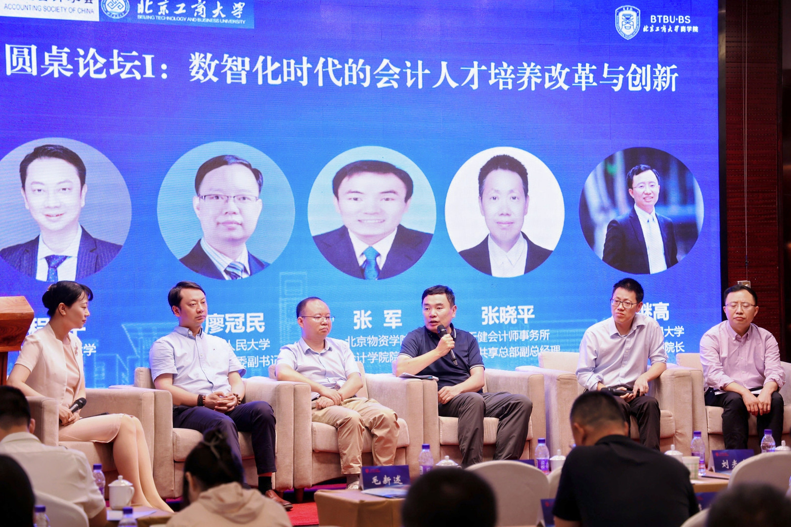 圆桌论坛分为上下两场。在“数智化时代的会计人才培养改革与创新”圆桌论坛环节,重庆理工大学会计学院程平教授、中国人民大学商学院党委副书记廖冠民教授、北京物资学院会计学院院长张军教授、天健会计师事务所数据共享总部副总经理张晓平、对外经济贸易大学国际商学院副院长祝继高教授分别从高校人才培养、用人单位需求等分享所在高校优秀经验和典型做法,以及会计师事务所对会计人才培养的改进建议。