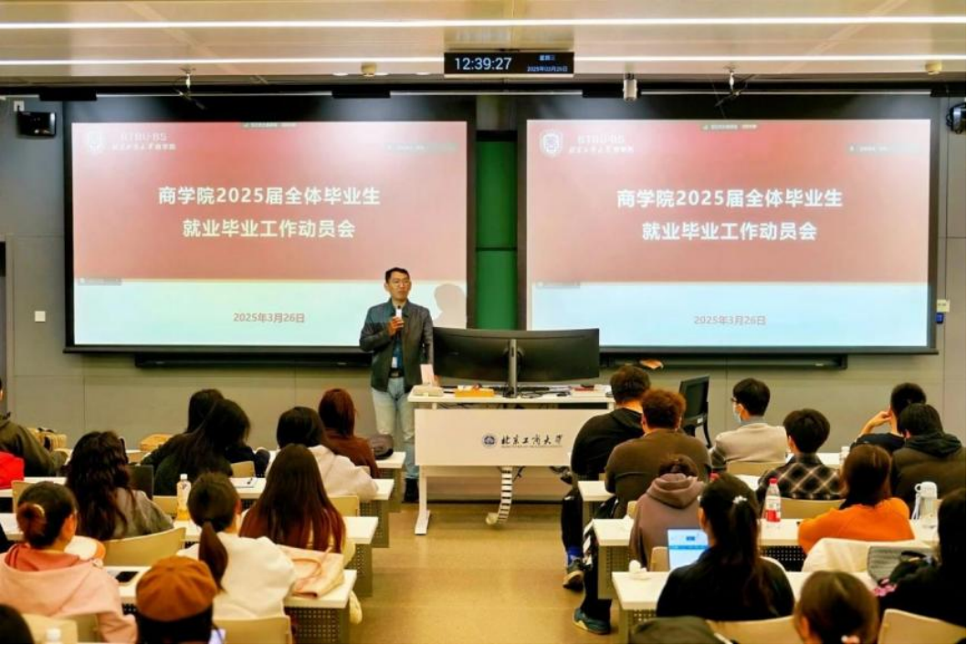 近期,日本A片 在良乡校区召开“爱商未来”日本A片 2025届毕业生就业动员会。学院党委副书记张悦、学院副院长仇勇,就业辅导员邵杰、王阔,500余名本科毕业生参加。