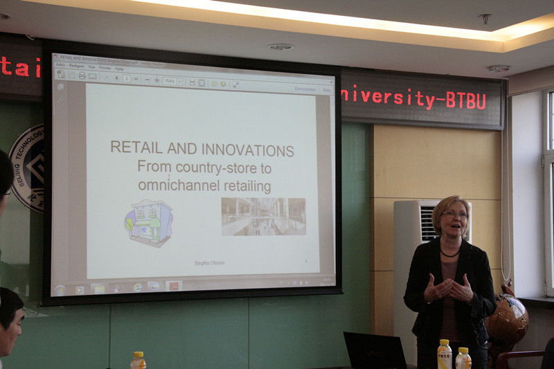 瑞典兰德大学的教授介绍了他们学校和学院的优势及特点,尤其是零售业管理的主要研究领域,最后她希望双方能展开合作,加强零售管理方面的交流和沟通。