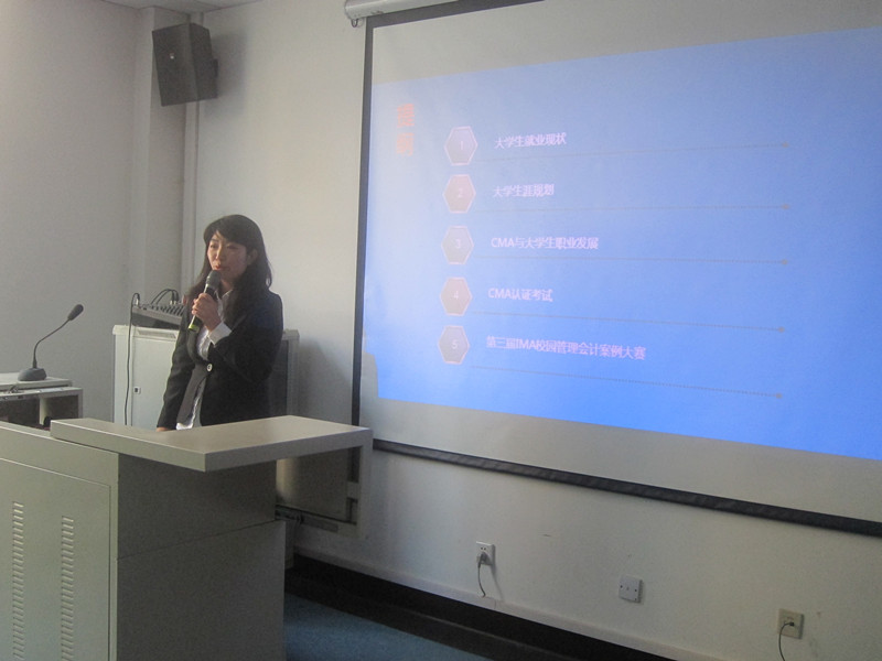 在阜成路校区,马丹为我院研究生介绍了IMA的历史演变和基本宗旨,分析了管理会计所涵盖的范畴,分享了第二届管理会计校园案例大赛的精彩视频,同时介绍了第三届(海尔杯)管理会计校园案例大赛的基本情况。