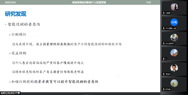 张伟华副院长主持讲座,对胡聪慧老师的学术背景进行介绍并表示热烈欢迎,毛新述院长和商学院师生共计50余人在线参与了本次讲座。胡聪慧老师研究领域为资本市场与公司财务、行为金融,侧重从资本市场制度设计、投资者行为偏误等角度理解资产价格和公司财务决策,近几年,在国内外重要核心期刊Journal of Corporate Finance、Journal of Financial Markets、Journal of Banking and Finance、《经济研究》、《管理世界》、《金融研究》、《会计研究》、《经济学(季刊)》等发表论文二十余篇。胡聪慧老师由浅入深,通过对智能投顾国内外相关研究进行梳理和评价,引申出主要研究内容,并基于一款影响力大、客户群体广的智能投顾软件,选取实验组和对照组进行实证分析,研究结果发现:订购智能投顾后,投资者在自主投资中,分散化投资和组合管理的意识显著提升,基金选择的行为偏误也一定程度降低。该项研究不仅为智能投顾的教育引导功能提供了直接的证据,而且基于真实投资场景的教育素材为金融教育在引导科学投资上的有效性提供了大样本的经验证据。会后部分老师就相关问题和胡老师进行了答疑互动。