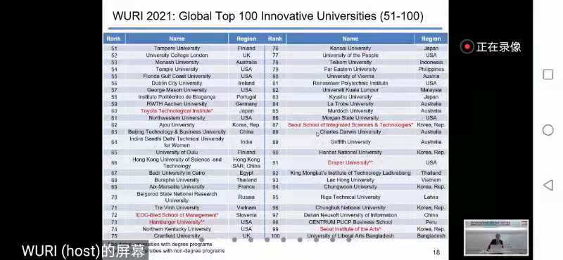6月10日北京时间晚9点,2021年世界最具创新力前100高校排名The World's Universities with Real Impact (WURI) Ranking for 2020在线会议举行,商学院国际交流与认证办公室刘婷主任等参加了会议。