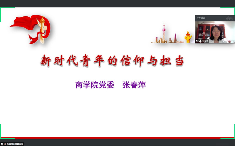 随后,学院党委书记张春萍以《新时代青年的信仰与担当》为题为全体学员们作党课。她从党员的信仰和初心、新时代发展的战略、青年的使命与担当三个维度展开,号召学员们端正入党动机,坚定共产主义信仰,不忘初心,争做新时代的奋进者、开拓者和奉献者。张书记讲解了新时代中国特色社会主义思想的内涵和主要内容,回顾了习近平总书记近年来对青年的殷殷寄语,总结了防控疫情期间我们党带领全国广大人民为战胜疫情所作出的努力和取得的成果,介绍了近期全国两会政府工作报告的主要内容,勉励同学们要坚定信念,将个人的发展与祖国的发展紧密融合,立德修身、勤于学习,勇于担当。她鼓励同学们在防疫居家期间做好时间规划,主动学习、勤于思考、加强锻炼,要注重身心健康,关爱家人,热心帮扶他人,积极参与志愿服务。张书记的党课深入浅出,紧贴国家发展和青年成才,引发了学员们对新时代青年的使命与担当的深入思考。