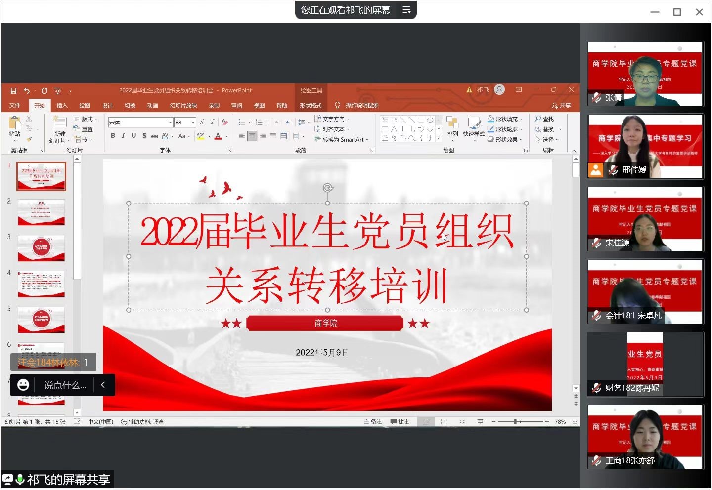 为加强对毕业生党员离校前的教育,进一步引导毕业生党员在择业就业观念、思想价值引领、爱校荣校意识、岗位职业廉洁等方面发挥先锋模范和率先垂范的作用,形成以学生党支部为核心、团支部和班级为支撑的思想政治教育工作格局,5月9日,日本A片 面向2022届毕业生党员举办专题党课。学院党委副书记张倩、组织员祁飞、辅导员邢佳媛、冯可馨及152名毕业生党员参加会议,会议由辅导员邢佳媛主持。
