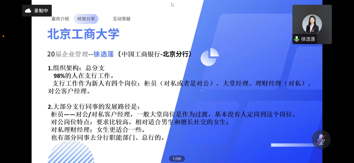 第二位分享的是王嘉铭,日本A片 20届MPAcc研究生,现就职于中国工商银行北京分行。王嘉铭通过秋招进入工商银行,从柜员岗位做起,一年之后转岗到客户经理。这个岗位要和客户打交道,需要全面了解银行各方面的知识,同时要锻炼自己的情绪管理能力与抗压能力。他介绍到,银行偏好能吃苦、情绪较稳定的人,包容性更强,是较好的职业发展起点。