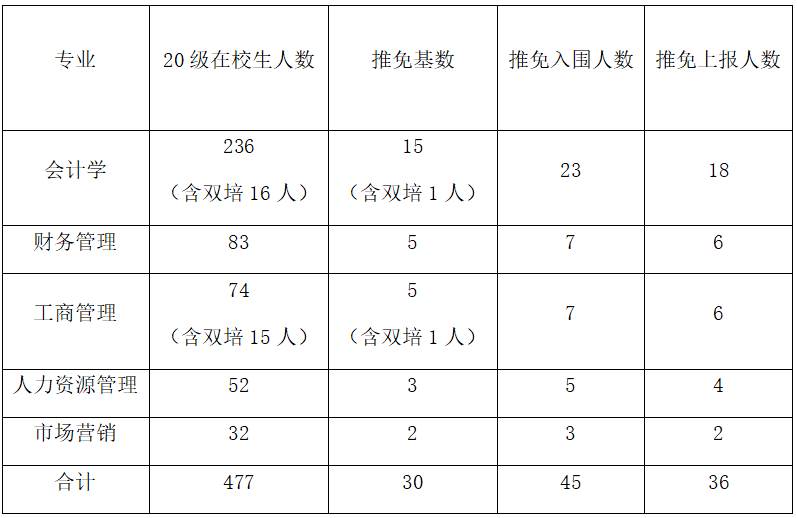 (三)各专业上报名额分配方法:各专业推免基数×120%上报比例。最终名额分配如下: