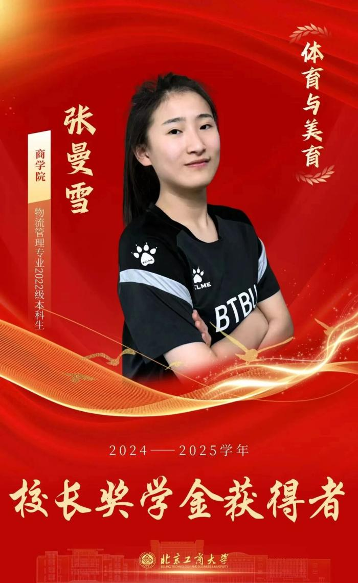 文明精神,强健体魄。张曼雪,大三学年绩点4.46,连续两年专业综测绩点双第一,累计获得优秀共青团员等荣誉20余项,积极参与学术竞赛,获“青创北京”2025年“挑战杯”首都大学生课外学术科技作品竞赛“青聚AI”人工智能+专项赛特等奖、“正大杯”第十五届全国大学生市场调查与分析大赛国家级三等奖等十余项奖项。担任班长兼团支书、学院党建活动中心副部长等职务,组织开展学生活动等80余次。积极参与志愿活动,累计志愿时长360小时,用实际行动传递青年担当。未来,她将继续秉持 “文明其精神,野蛮其体魄” 的信念,争做全面发展的北工商人。