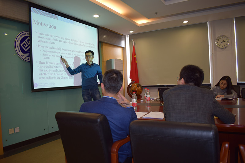 陈旸旸副教授首先对所报告文章的构思做了介绍,阐述了如何发现当前已有相关研究的空白地带,以及该怎样将学术灵感转化为学术成果;继而对所报告的论文做了逻辑清晰,层次分明,结构严谨的详细解读。文章认为,公司与共同基金之间的交叉审计会影响审计师的独立性。具体而言,即当公司与其共同基金雇佣同一审计机构时,公司更有可能收到无保留意见报告,且由于投资者不能在短期内发现交叉审计对审计意见的影响,因此共同基金可以利用短时间内的信息不对称获利,与此同时,被公司和共同基金聘用的审计机构也能获得更高的审计费用和更过审计业务。陈旸旸副教授的最新研究成果说明了交叉审计可能带来的市场违规行为,对股市监管有着很强的借鉴意义。与会老师和研究生同陈旸旸副教授就论文进行了热烈讨论。
